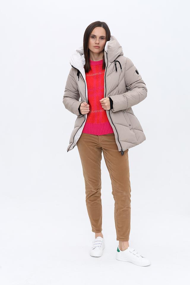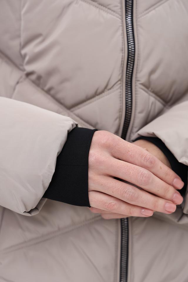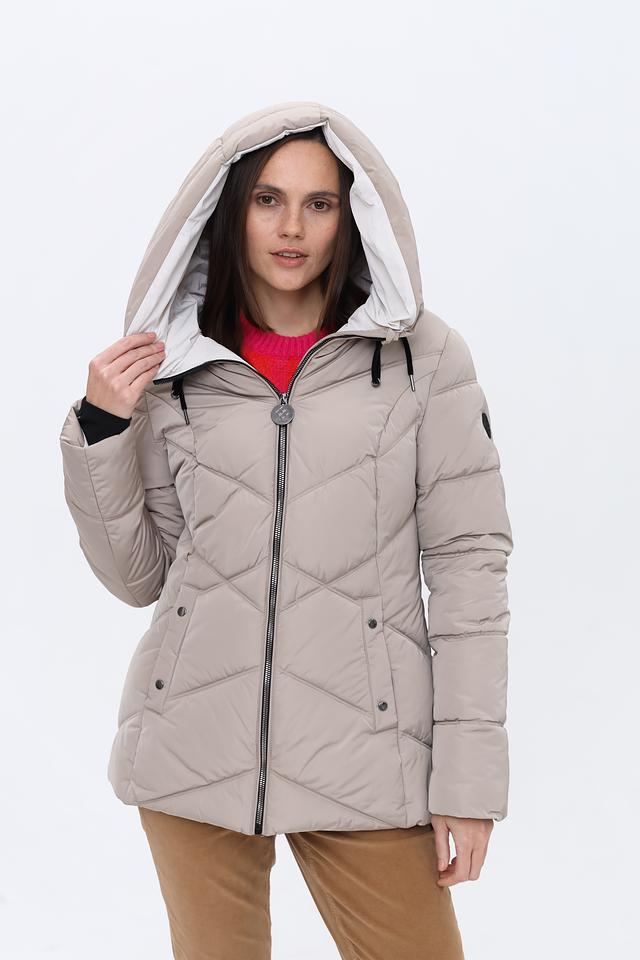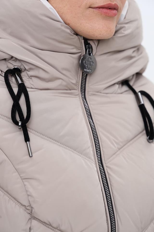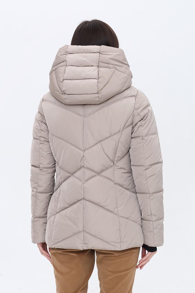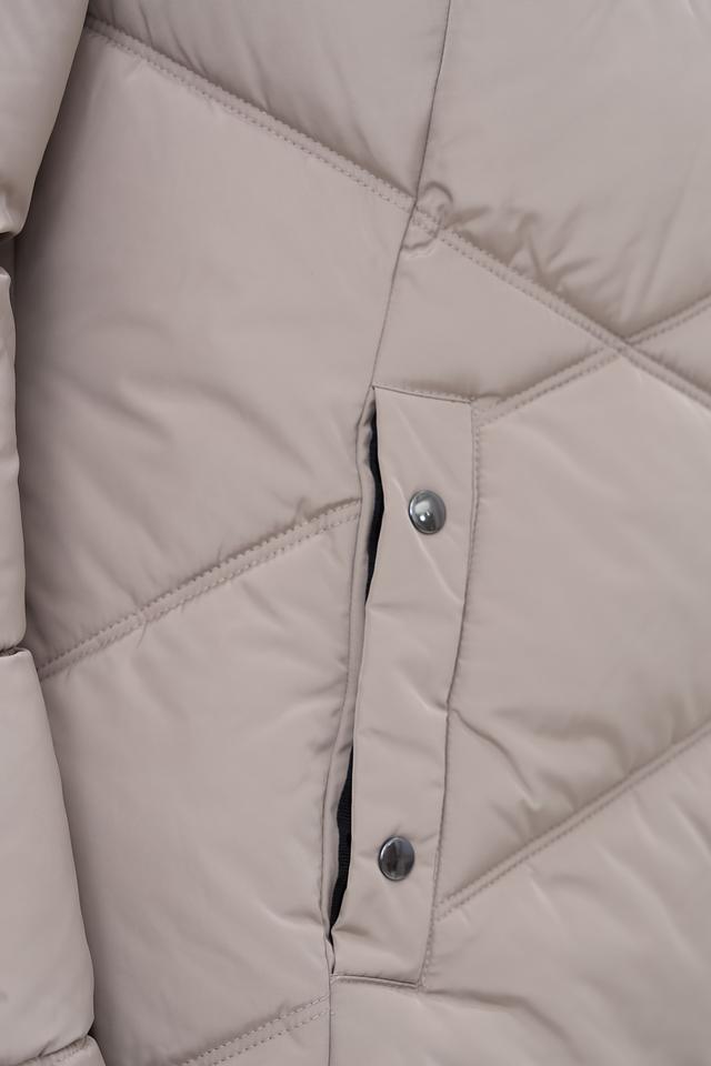 Куртка имеет стеганую фактуру, которая придает ей современный вид. Бежевый цвет делает ее универсальной и легко сочетаемой с различными элементами одежды.