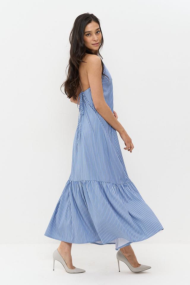 Длинное платье BE YOU голубого цвета в белую полоску — идеальный выбор для летнего гардероба. Модель выполнена в свободном крое, имеет регулируемые бретели и многослойную юбку. Состав: