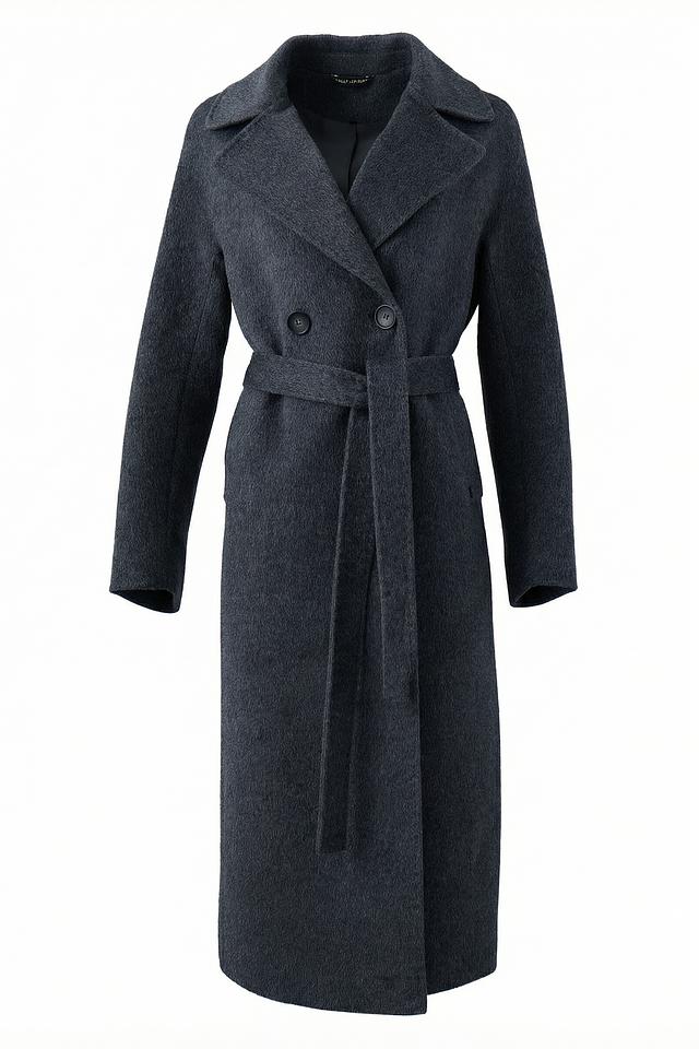Пальто имеет прямой, слегка расклешенный силуэт, который подходит для разных типов фигур. Длина пальто – макси, что обеспечивает дополнительную защиту от холода. Застежка – двубортная, с крупными пуговицами в тон изделия. Воротник – широкий, отложной.