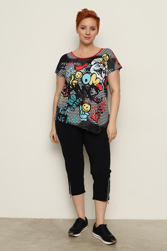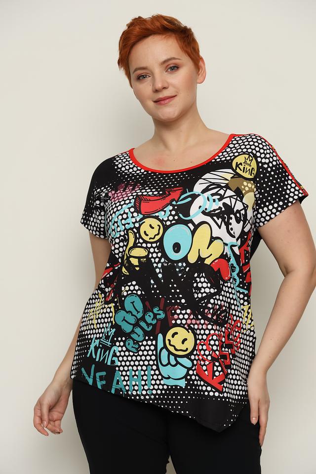 Женская футболка Doris Streich чёрного цвета с ярким принтом в стиле комиксов. Модель выполнена из мягкой вискозы с добавлением эластана, обеспечивающего комфортную посадку. Оригинальный дизайн и свободный крой делают эту футболку отличным выбором для повседневного образа. Состав: вискоза 92%, эластан 8%