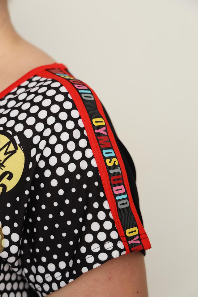 Особенности модели: короткий рукав, округлый вырез горловины, свободный крой. Отделка горловины и рукавов выполнена контрастной красной полосой. Футболка идеально подходит для создания непринужденных и стильных образов. Она легко сочетается с джинсами, брюками или юбками.