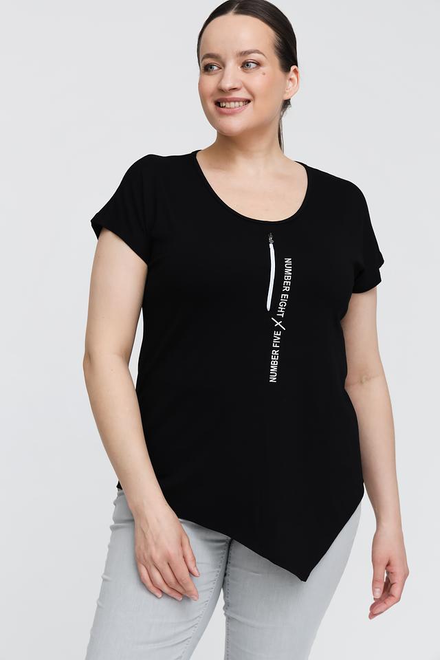 Чёрная футболка от Doris Streich с асимметричным низом и вертикальным принтом. Модель выполнена из мягкой вискозы с добавлением эластана для комфортной посадки. Состав: вискоза 96%, эластан 4%