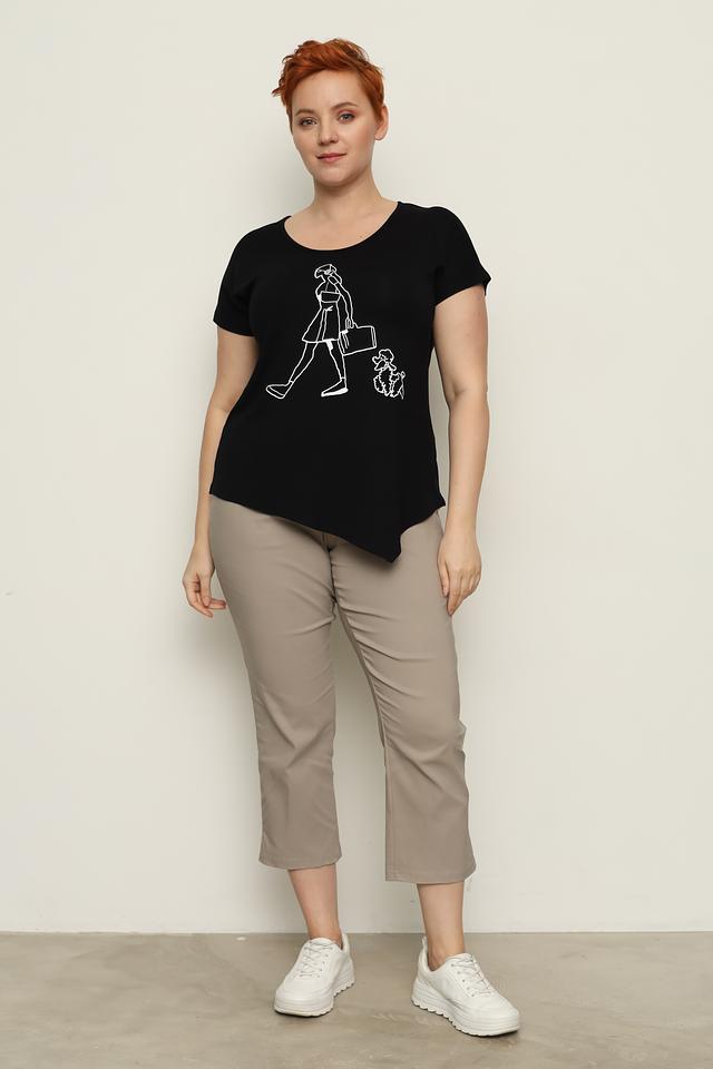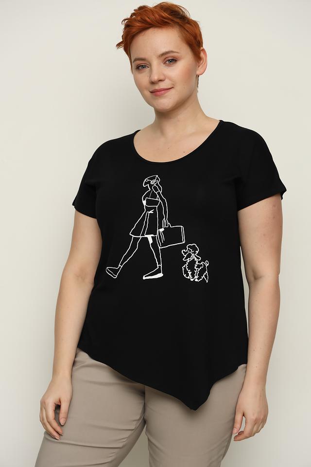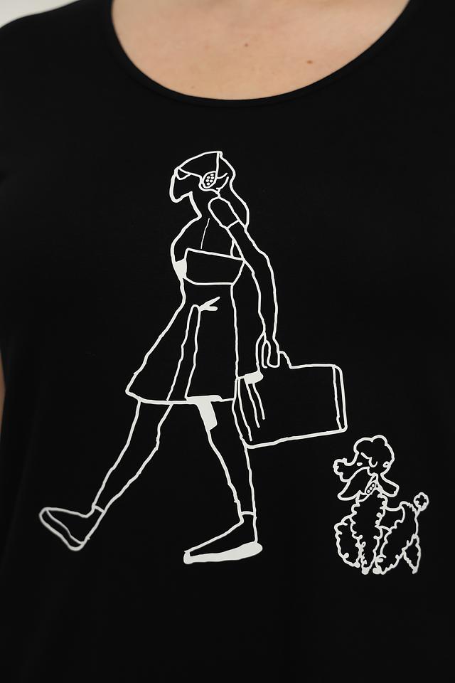 Блуза имеет свободный крой и длину до бедра, что делает ее универсальной для разных типов фигур. Вырез горловины округлый, а короткие рукава добавляют легкости образу. Главная особенность этой модели – стильный принт на лицевой стороне, изображающий девушку, идущую с собачкой.