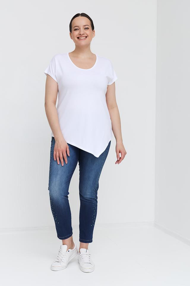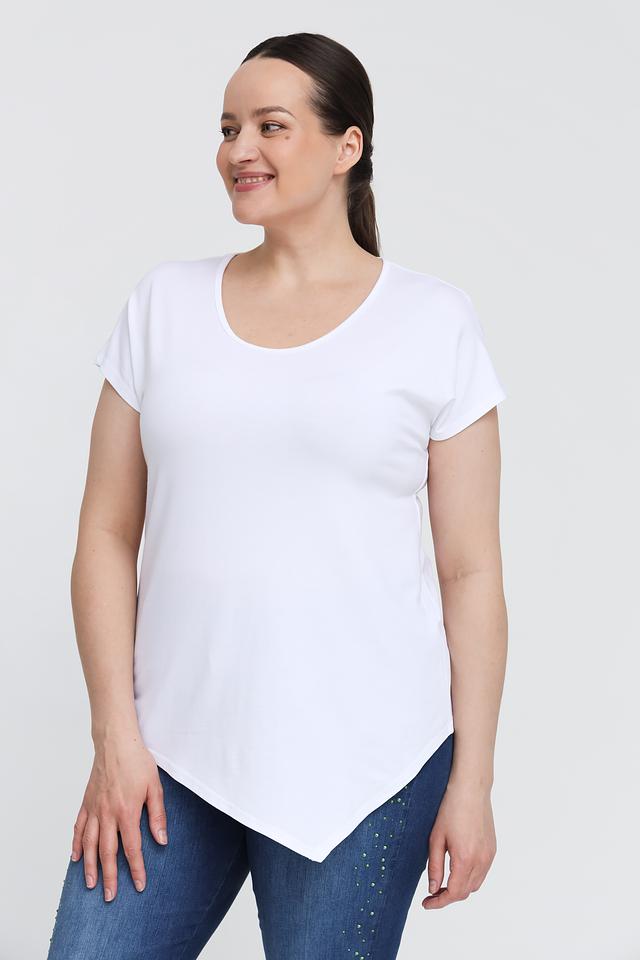 Белая футболка от Doris Streich с асимметричным низом и короткими рукавами. Изготовлена из мягкой вискозы с добавлением эластана для комфорта и хорошей посадки. Идеальный выбор для создания повседневных образов. Состав: вискоза 96%, эластан 4%