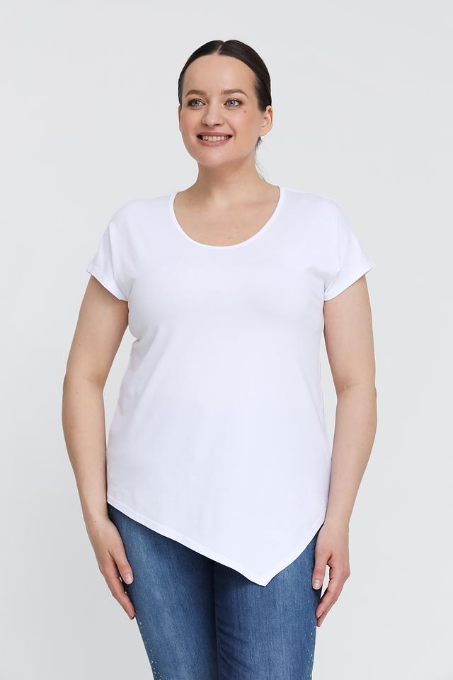Особенностью данной модели является асимметричный низ, который придает ей оригинальность и современный вид. Футболка имеет короткие рукава и круглый вырез горловины.