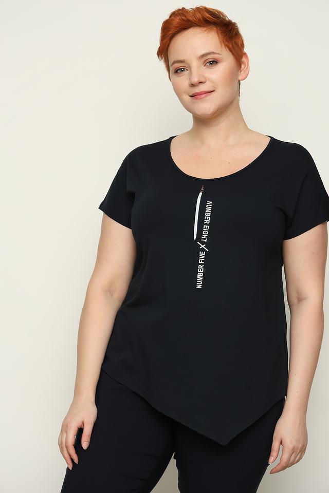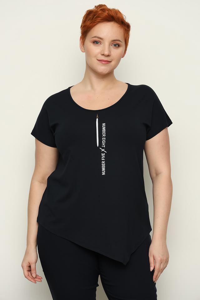 Чёрная футболка от Doris Streich с асимметричным кроем и вертикальной белой надписью. Изготовлена из мягкой вискозы с добавлением эластана для комфорта и свободы движений. Состав: вискоза 96%, эластан 4%