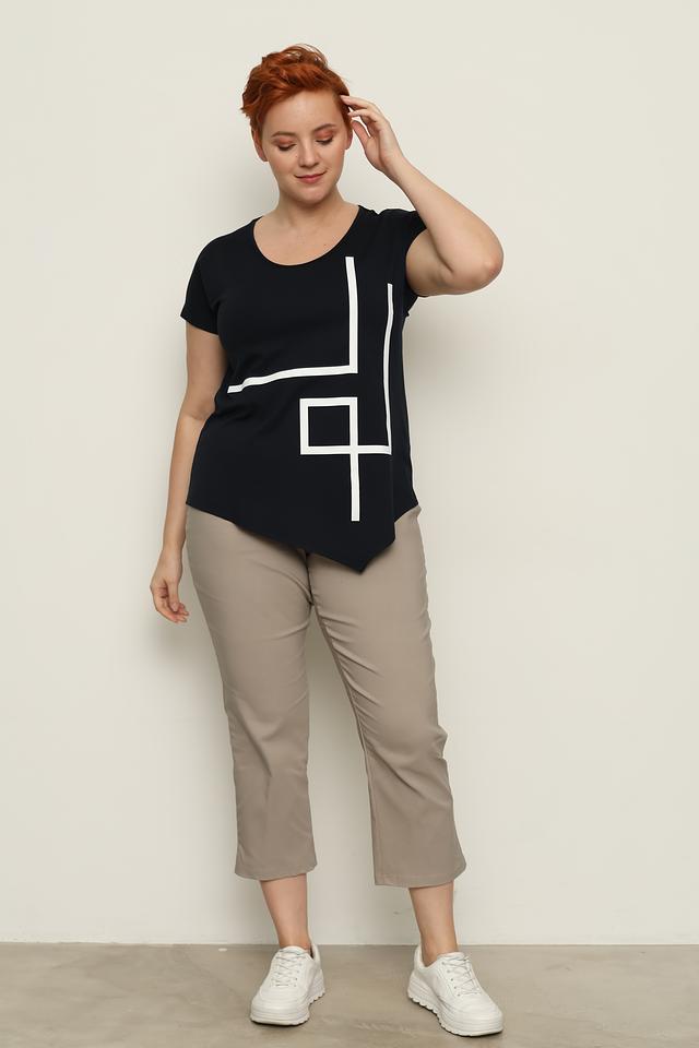 Особенностью данной модели является графичный белый принт, который добавляет образу оригинальности и динамики. Блуза имеет свободный крой, который обеспечивает комфорт в носке, а короткие рукава делают её идеальным выбором для тёплой погоды.