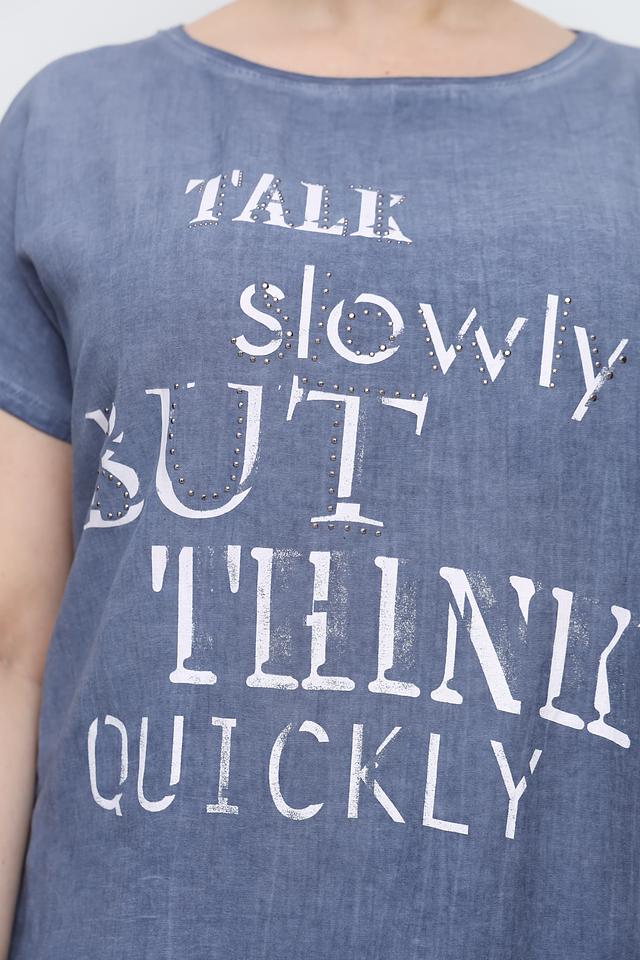 Футболка имеет свободный крой, который не сковывает движений и позволяет создать расслабленный образ. Особенностью модели является яркий принт с надписью "TALK slowly BUT THINK QUICKLY", который добавит индивидуальности вашему стилю.