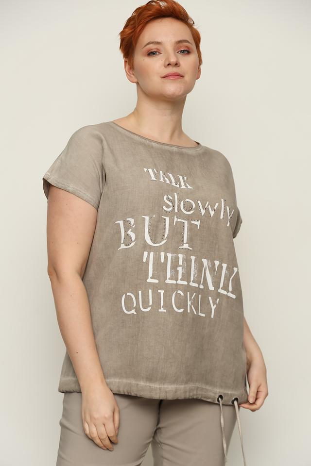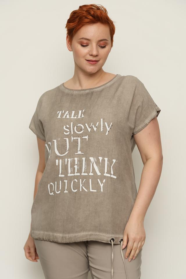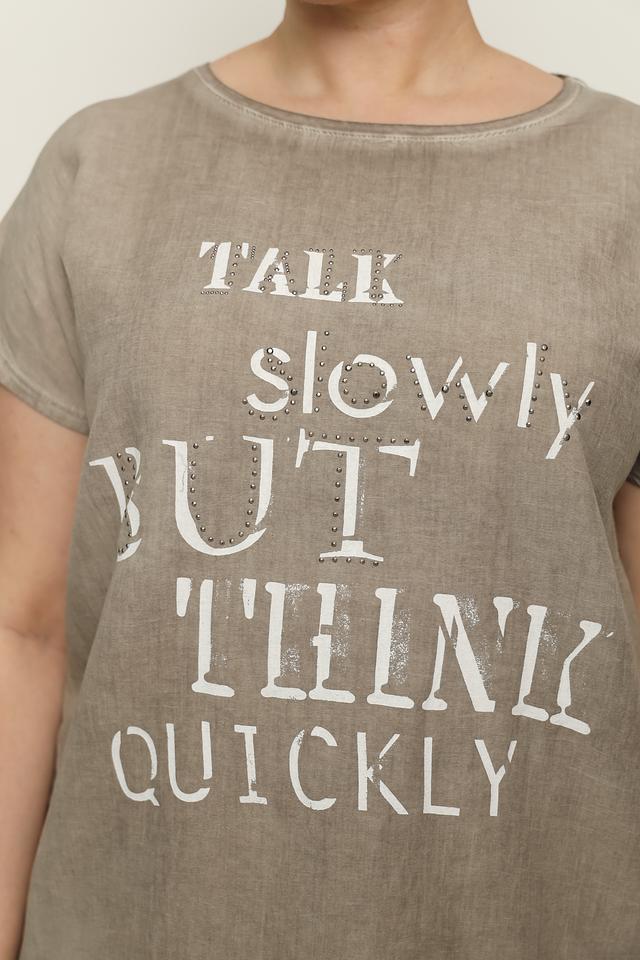 Эта стильная блуза от бренда Doris Streich станет отличным дополнением к вашему гардеробу. Она выполнена в сером цвете и украшена эффектным белым принтом с надписью "TALK slowly BUT THINK QUICKLY".