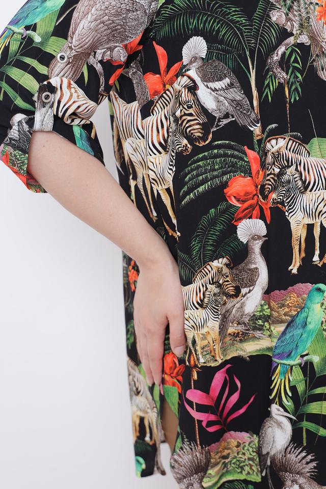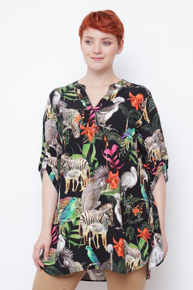 Основной цвет блузы – чёрный, который служит идеальным фоном для красочного принта "Сафари". На блузе изображены различные африканские животные, такие как зебры, жирафы, птицы и тропические растения, выполненные в ярких и насыщенных цветах.