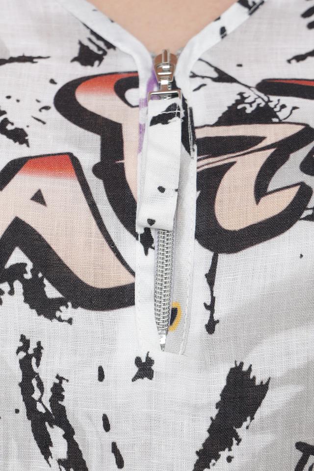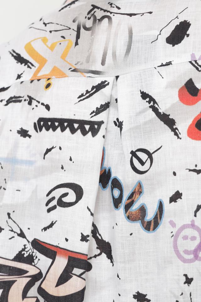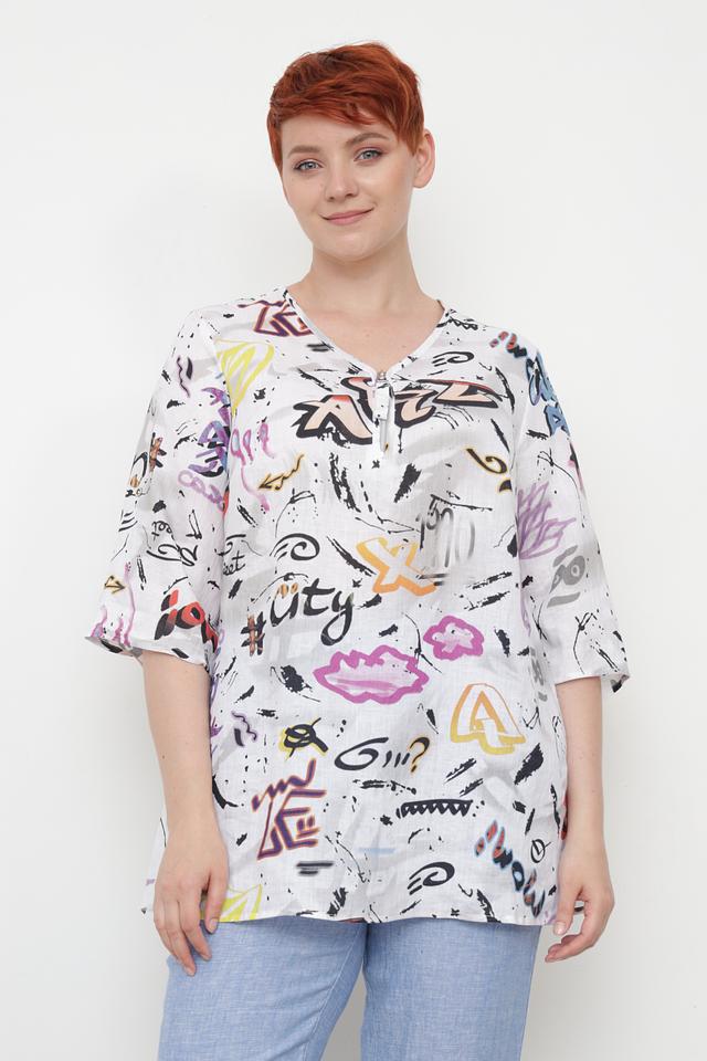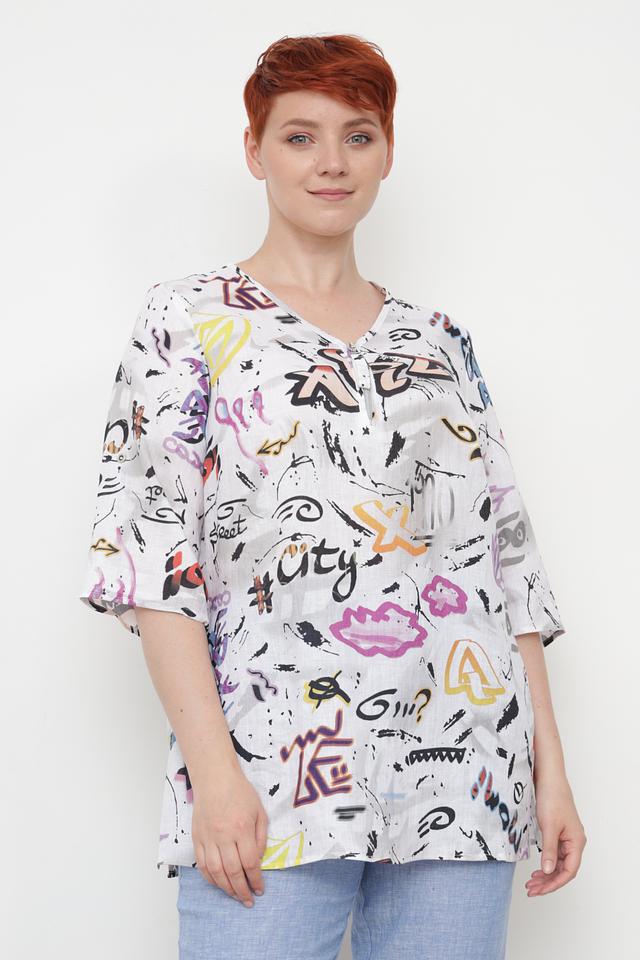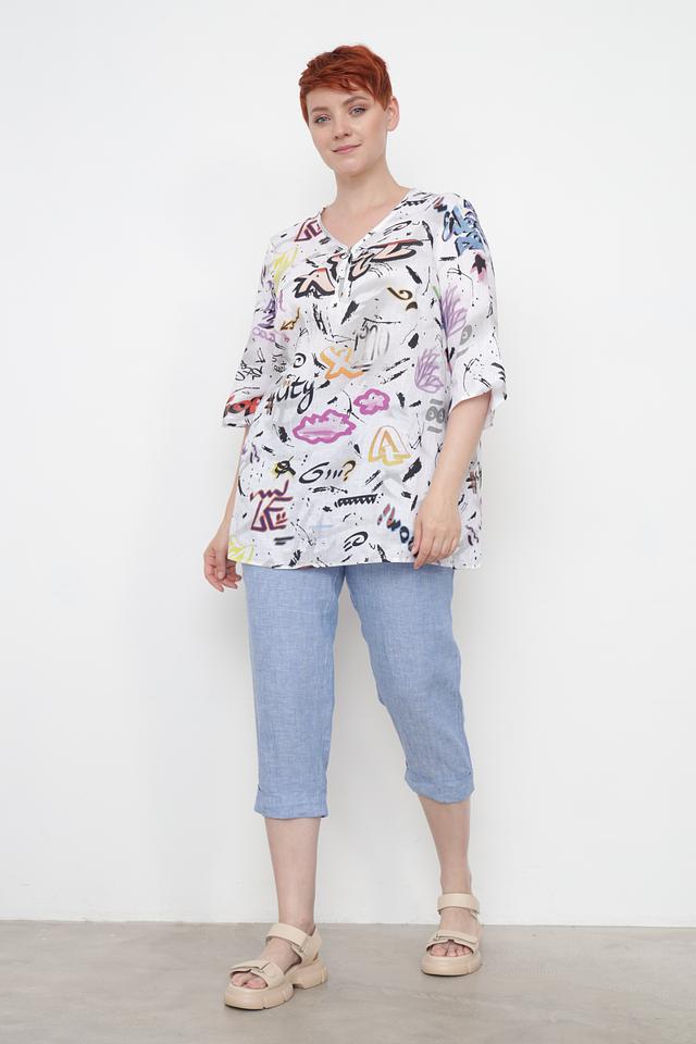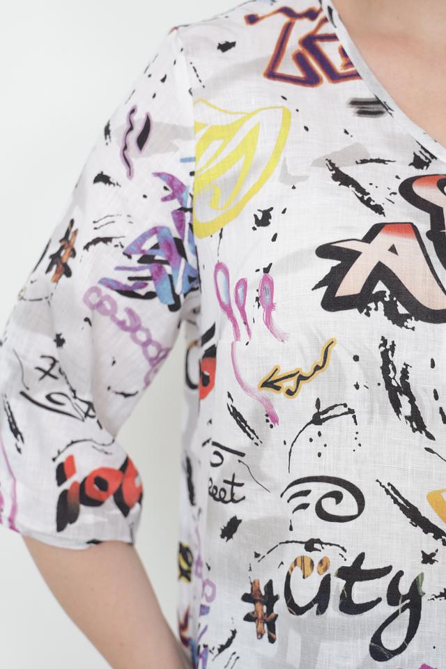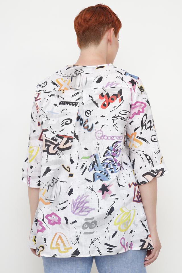 Белая блуза от Doris Streich с ярким принтом в виде граффити станет стильным дополнением к вашему гардеробу. Модель свободного кроя из 100% льна обеспечит комфорт в жаркую погоду. Состав: лен 100%