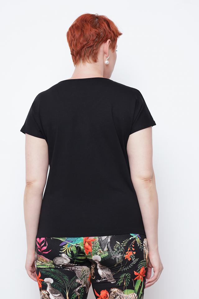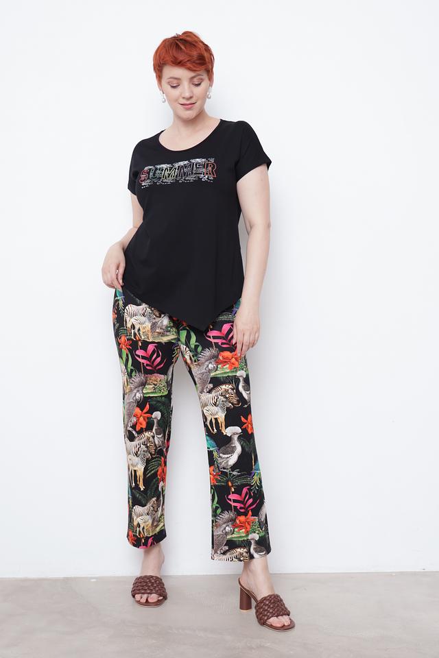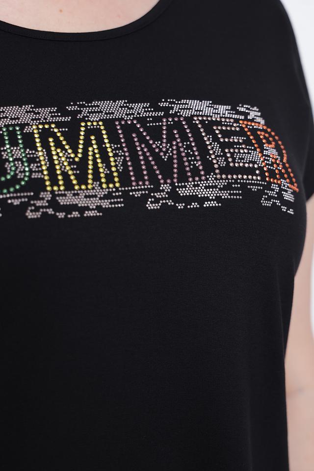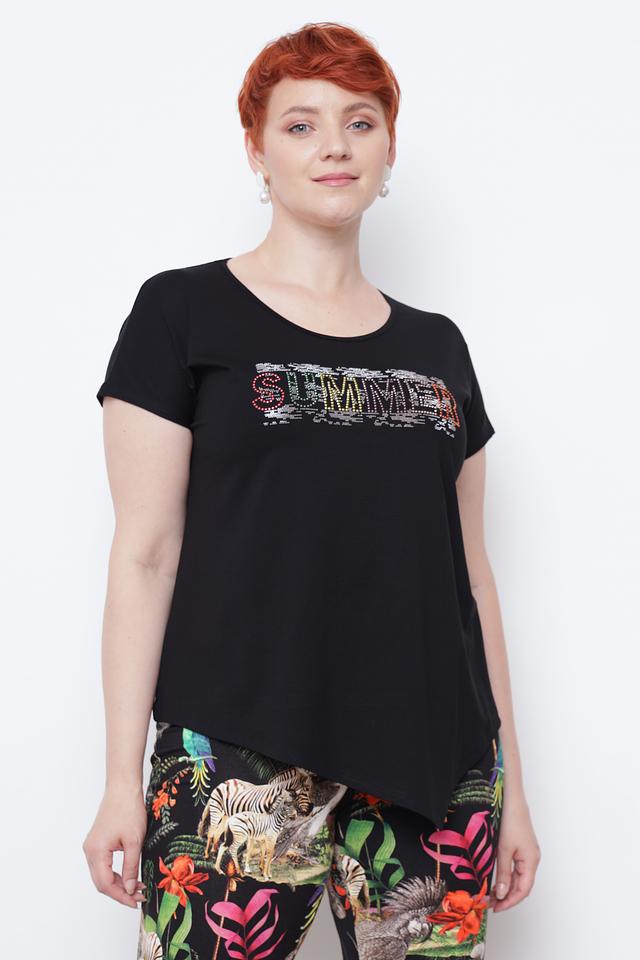 Чёрная футболка от Doris Streich с ярким принтом "SUMMER" — стильная и комфортная модель из вискозы с добавлением эластана. Футболка имеет свободный крой и асимметричный подол, что придает ей оригинальность. Состав: вискоза 96%, эластан 4%