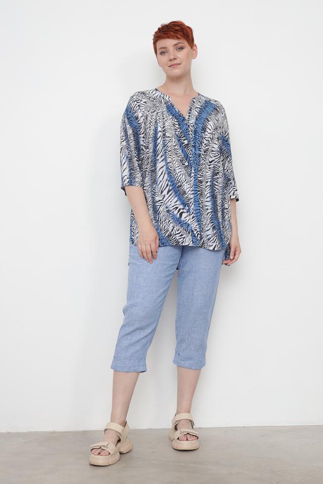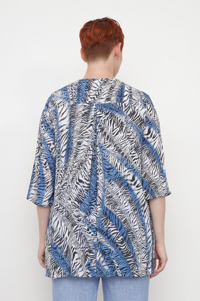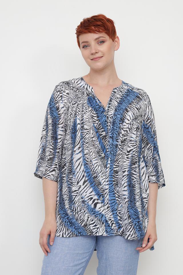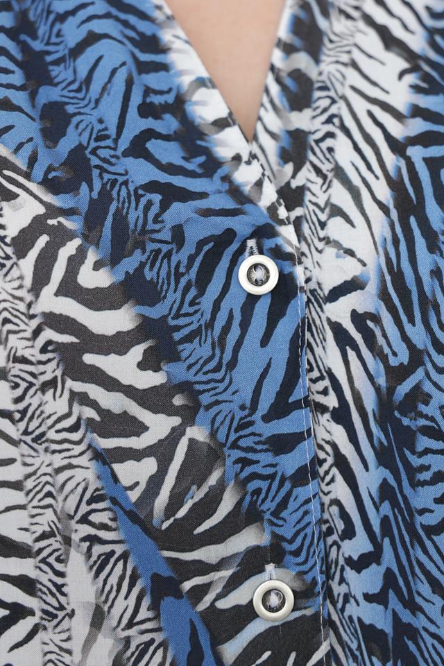 Особенностью данной модели является яркий принт в виде абстрактной "зебры", сочетающий в себе оттенки синего, белого и черного. V-образный вырез горловины и застежка на пуговицы добавляют блузе изысканности.