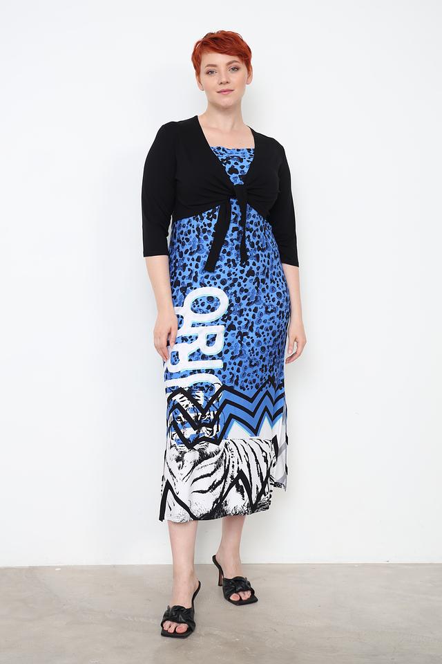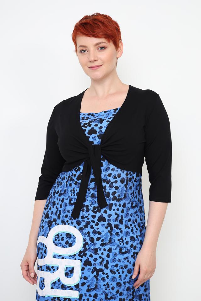 Жакет имеет короткий рукав 3/4 и V-образный вырез. Оригинальным элементом дизайна являются завязки спереди, которые позволяют регулировать силуэт и создавать различные образы. Завязки можно завязать бантиком или оставить свободно свисающими.