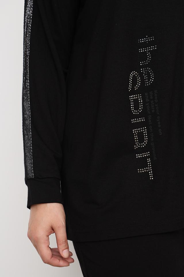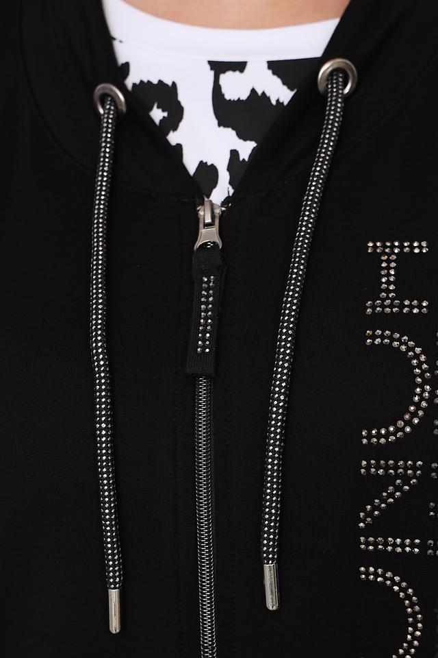Кардиган имеет удобную застёжку на молнии, капюшон со шнурками и длинные рукава. Декоративные элементы в виде надписей и полос с блестящей нитью придают изделию современный и стильный вид.