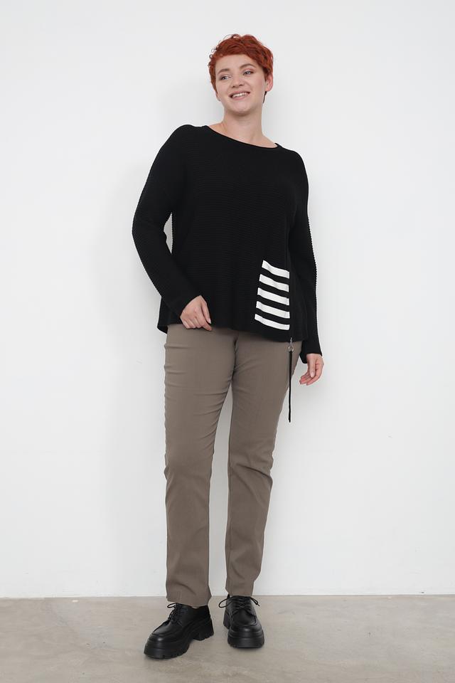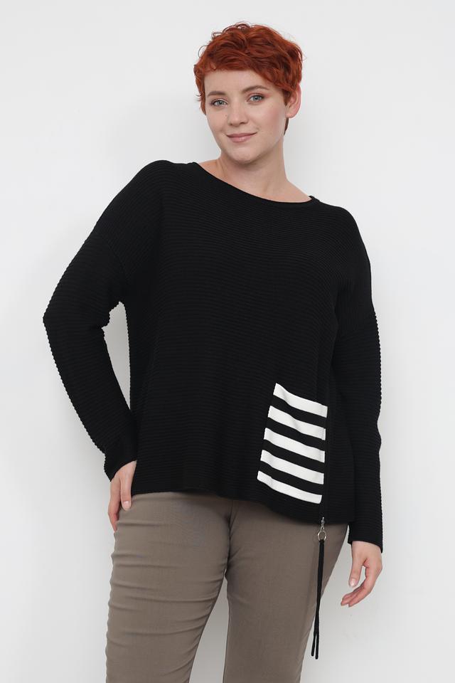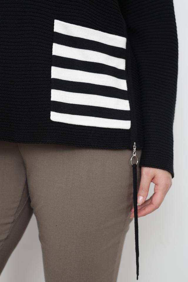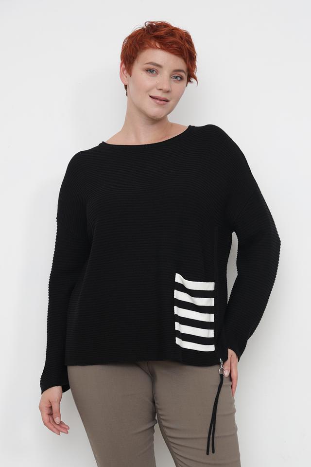Пуловер имеет свободный крой и круглый вырез горловины. Декоративные вертикальные полосы белого цвета добавляют оригинальности и акцентируют внимание. Сбоку изделия расположена молния и шнурок, что позволяет регулировать силуэт и создавать различные образы.