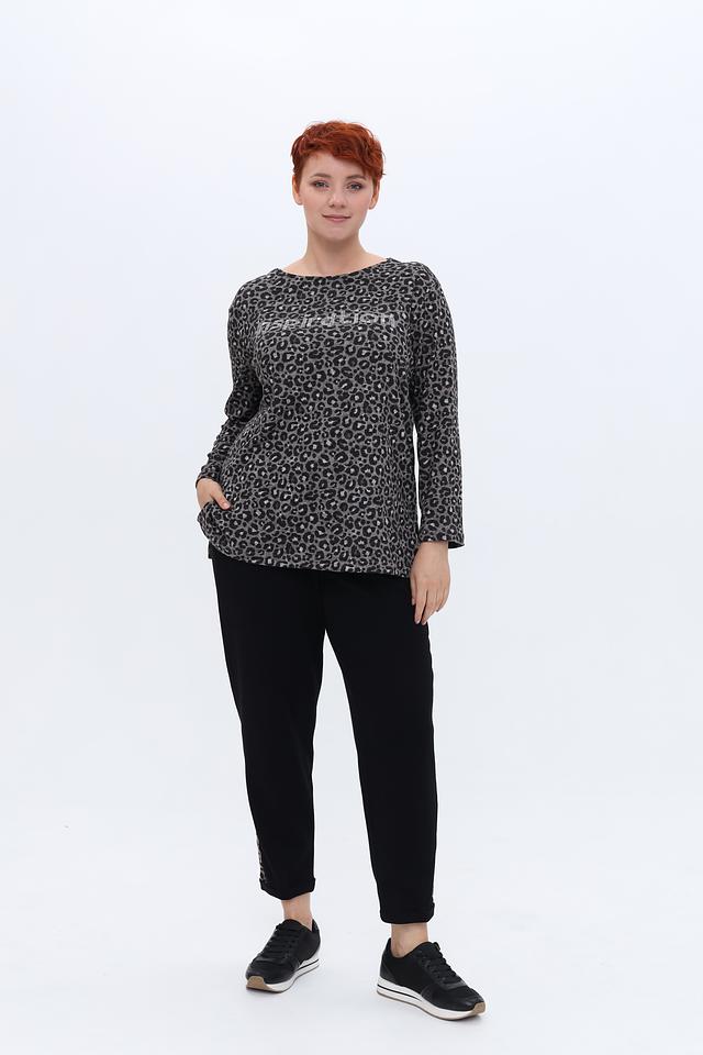 Стильный пуловер от Doris Streich серого цвета с леопардовым принтом и надписью. Модель выполнена из мягкого и приятного к телу трикотажа, обеспечивающего комфорт в носке. Состав: полиэстер 72%, вискоза 25%, эластан 3%