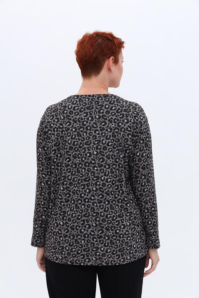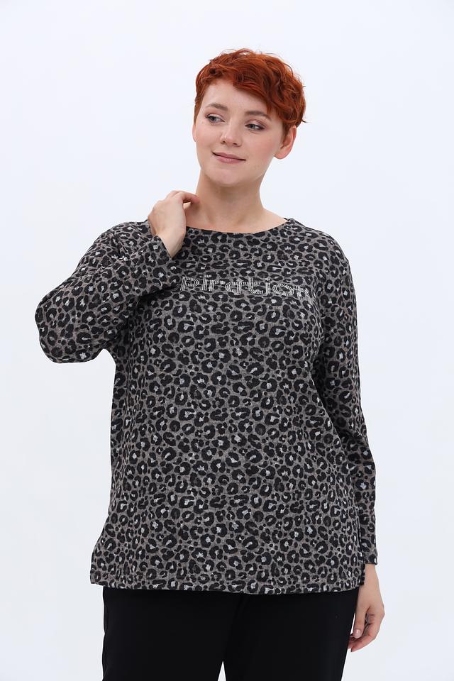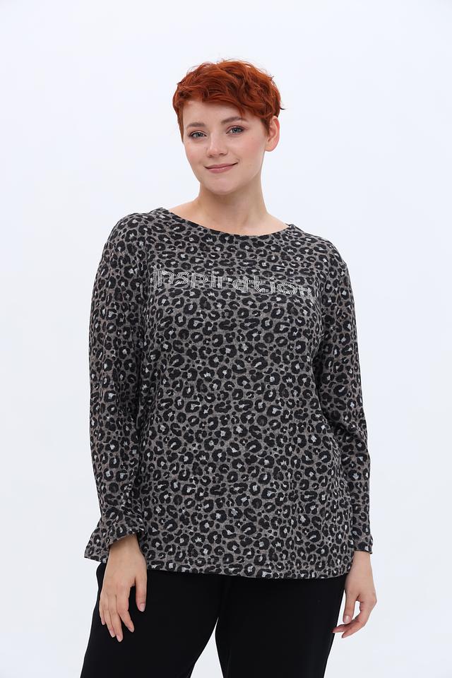 Пуловер имеет серый цвет с эффектным леопардовым принтом, который добавляет образу динамичности и стиля. На передней части изделия расположена надпись, выполненная в контрастном цвете, что придает ему индивидуальность.