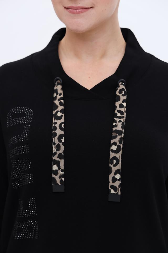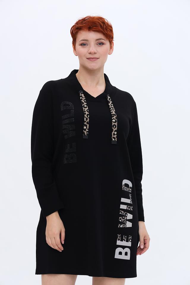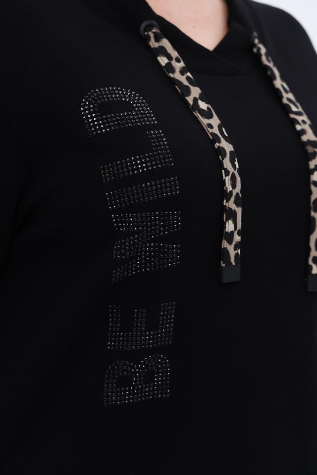 Это стильное платье от бренда Doris Streich станет отличным дополнением к вашему гардеробу. Платье выполнено в чёрном цвете и украшено яркой надписью "BE WILD" с декоративной отделкой из страз и леопардового принта на шнурках капюшона.