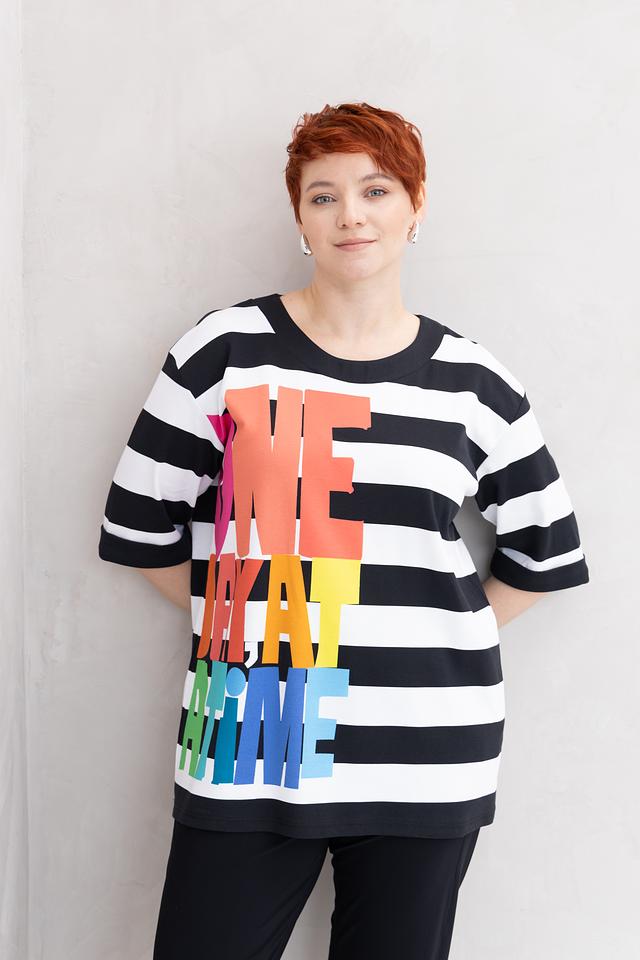 Женская футболка Doris Streich чёрно-белого цвета с ярким радужным принтом "We make a time". Модель свободного кроя с короткими рукавами выполнена из мягкого хлопка с модалом и небольшим добавлением эластана. Состав: хлопок 49%, модал 49%, эластан 2%