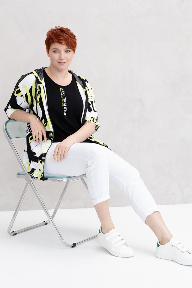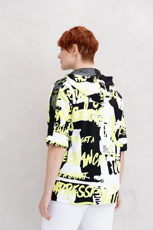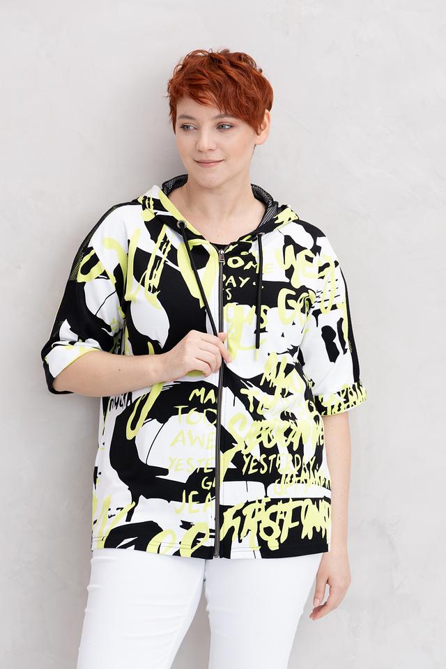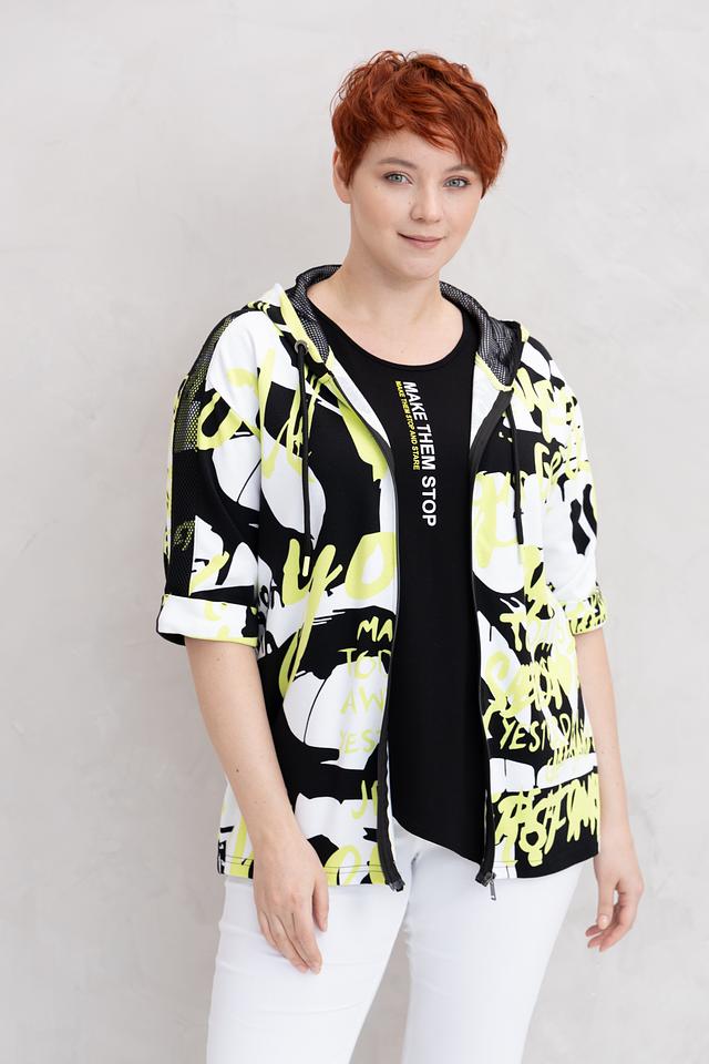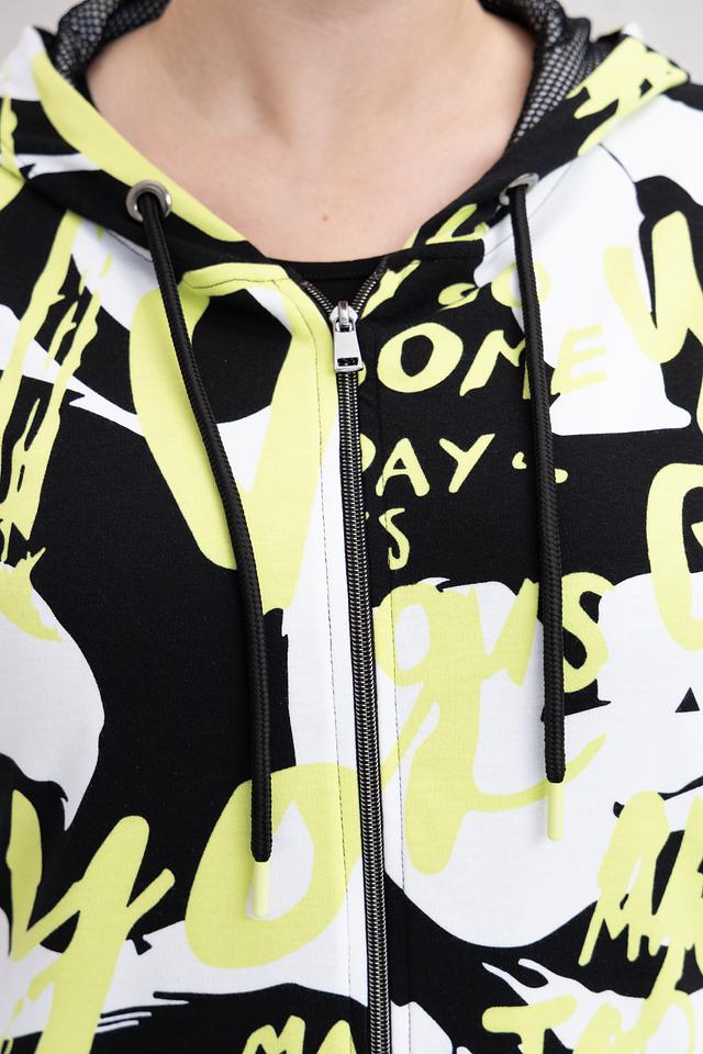 Жакет от Doris Streich чёрного цвета с ярким графичным принтом станет стильным дополнением к вашему образу. Модель с капюшоном и застежкой-молнией, выполнена из мягкой и приятной к телу ткани. Состав: хлопок 49%, модал 49%, эластан 2%
