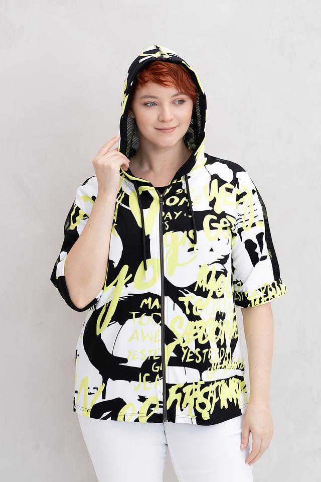 Модель имеет прямой крой, капюшон и застёжку-молнию. Рукава объёмные, три четверти. Жакет идеально подходит для создания модных и комфортных образов в повседневном стиле.