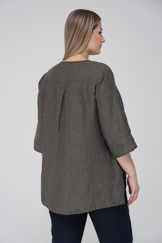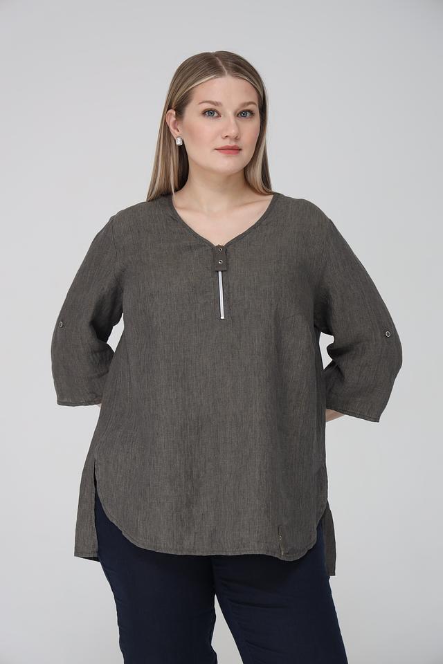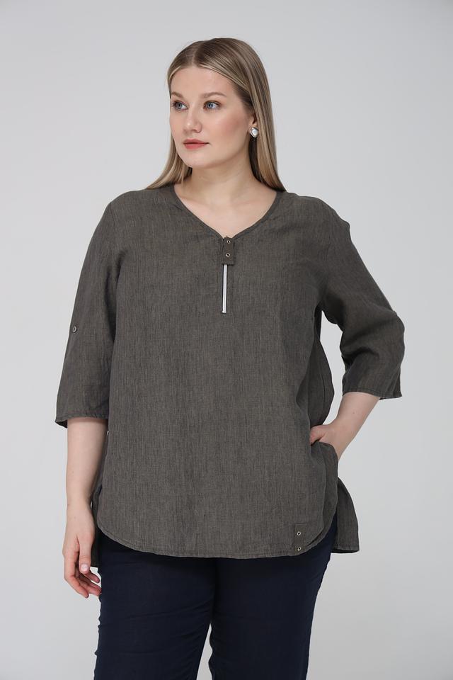 Блуза от Doris Streich цвета хаки выполнена из 100% льна и имеет удобный V-образный вырез с планкой на пуговицах. Модель с рукавом 3/4 и боковыми разрезами для свободы движений. Состав: лен 100%