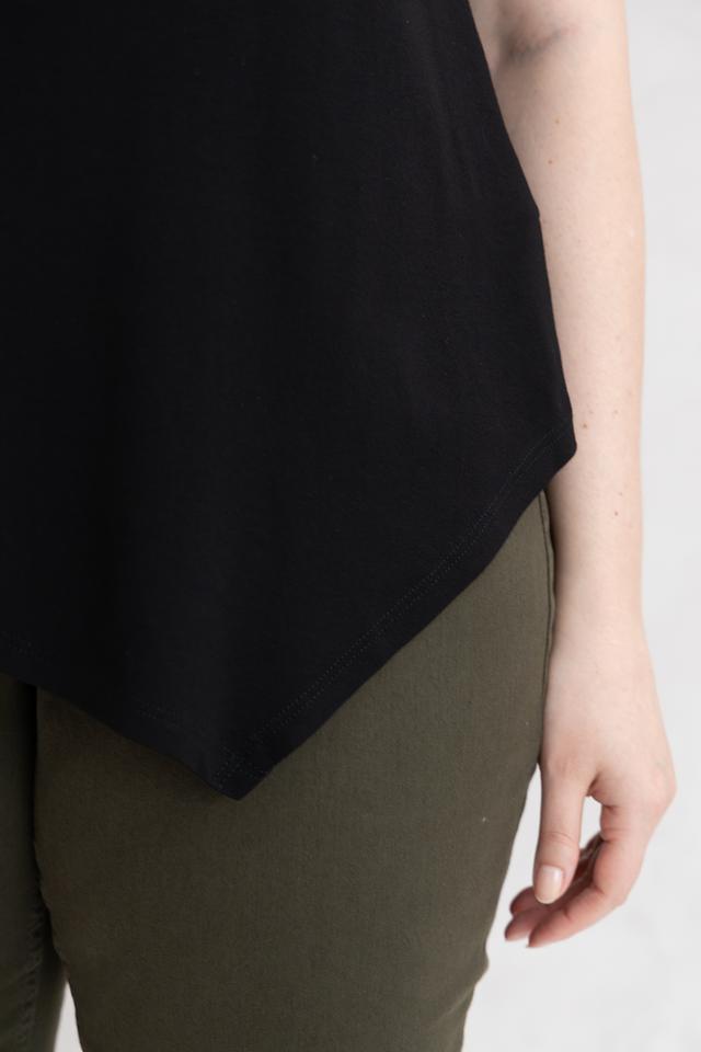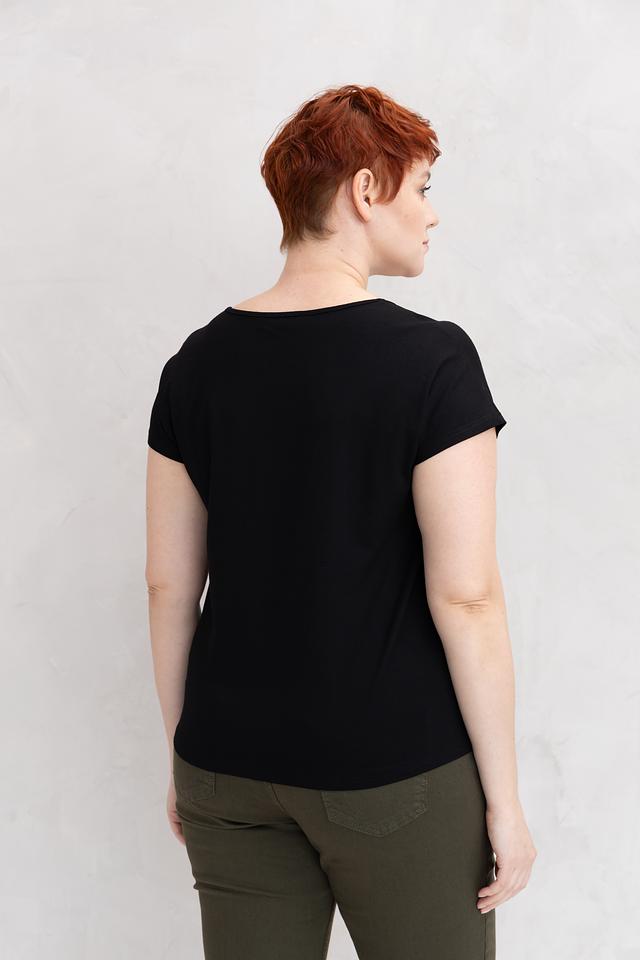 Крой футболки слегка асимметричный, с завышенной линией низа, что придает ей современный и стильный вид. Короткие рукава и округлый вырез горловины обеспечивают комфорт в носке. Эта футболка идеально подходит для создания повседневных образов, а также для более интересных и необычных сочетаний.