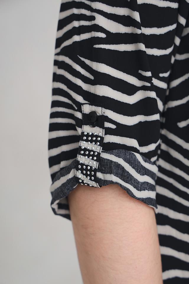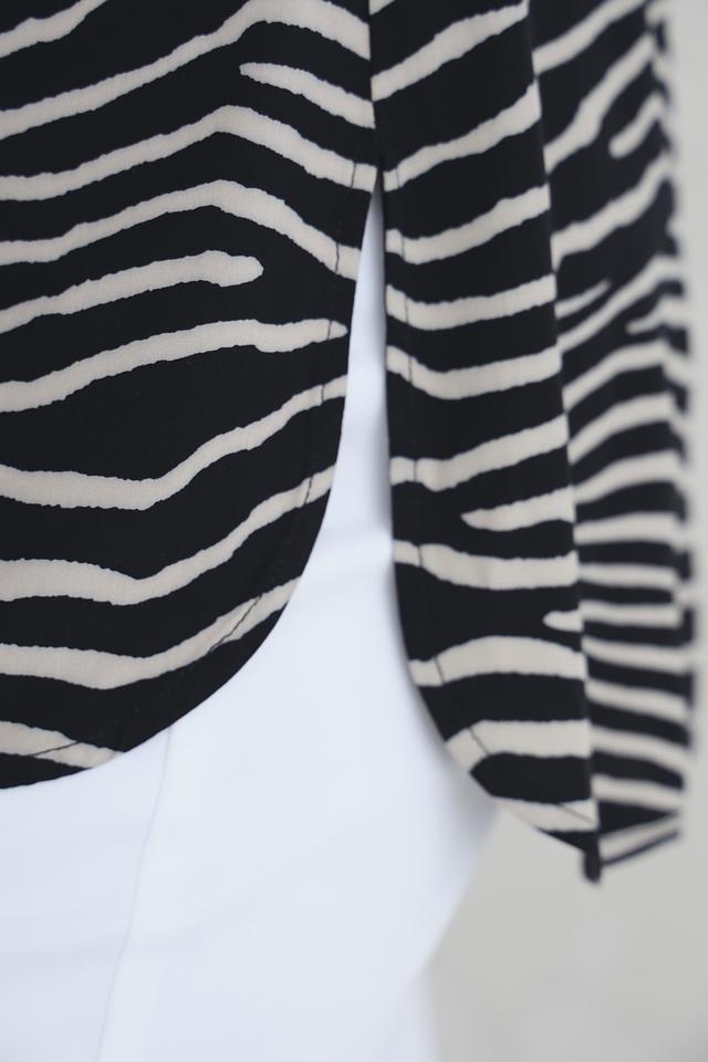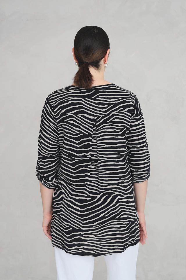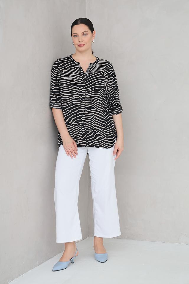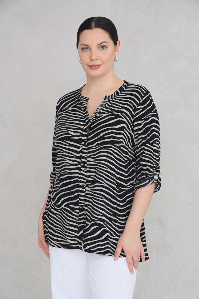 Эта стильная блуза от Doris Streich станет отличным дополнением к вашему гардеробу. Блуза выполнена в чёрно-белой цветовой гамме с выразительным полосатым принтом, напоминающим окрас зебры.