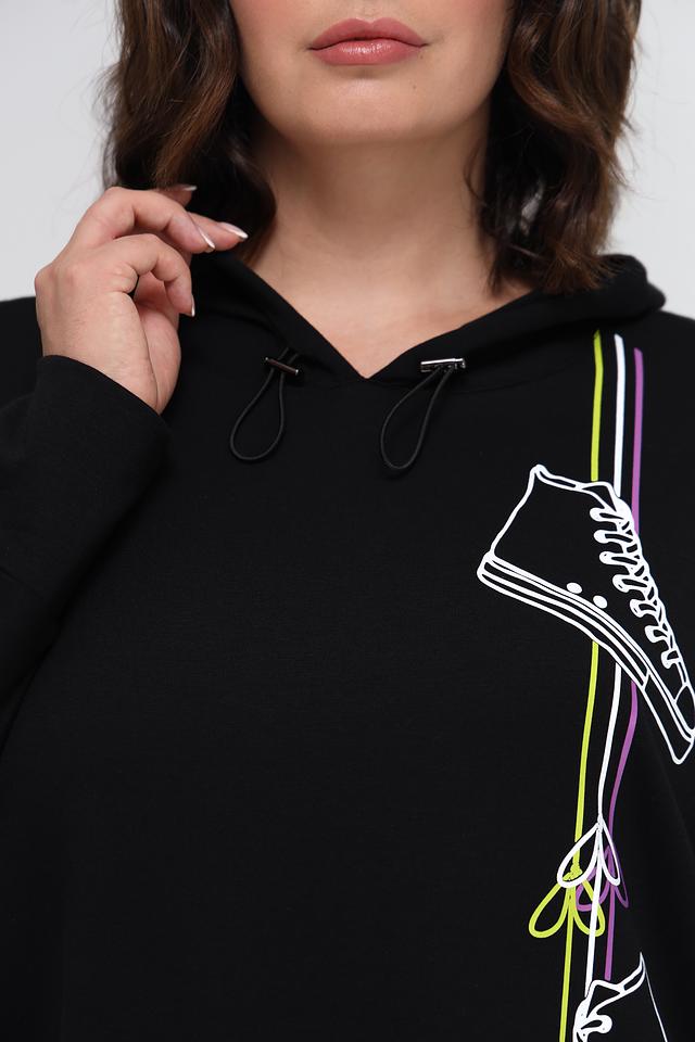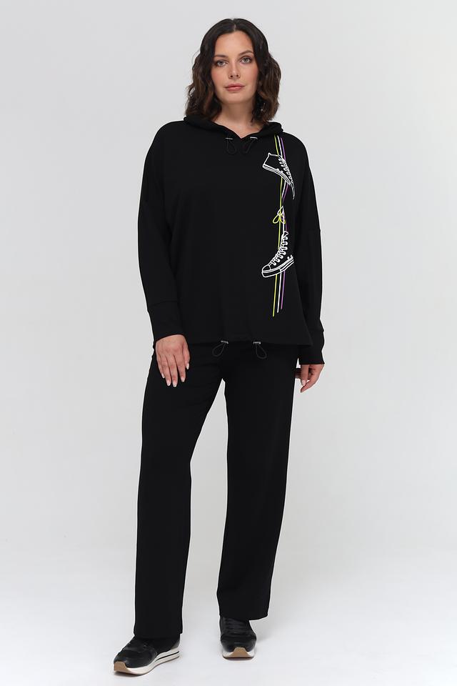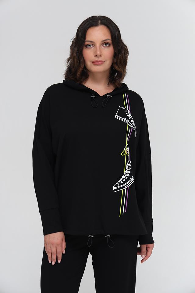 Чёрный пуловер от Doris Streich с оригинальным принтом в виде кроссовок. Модель выполнена из мягкого и приятного к телу сочетания хлопка и модала, обеспечивая комфорт в носке. Удобный капюшон и свободный крой делают этот пуловер идеальным выбором для повседневного образа. Состав: хлопок 49%, модал 49%, эластан 2%