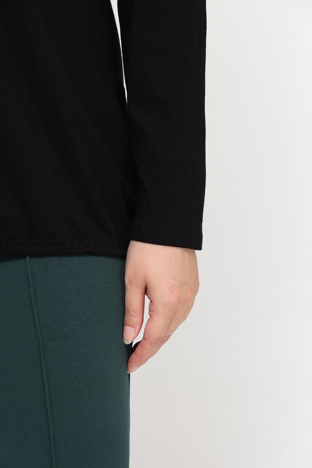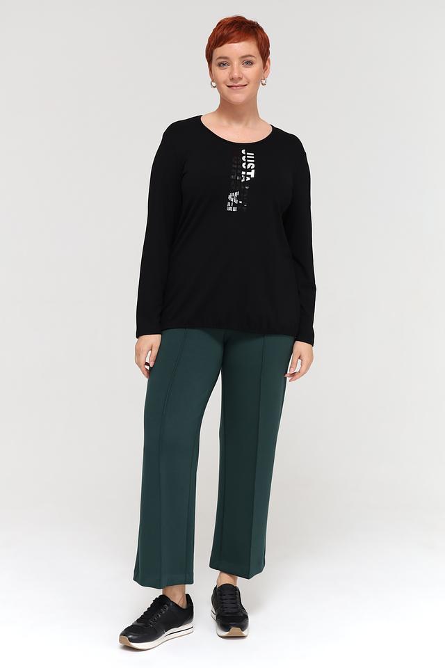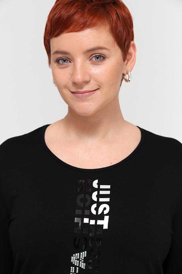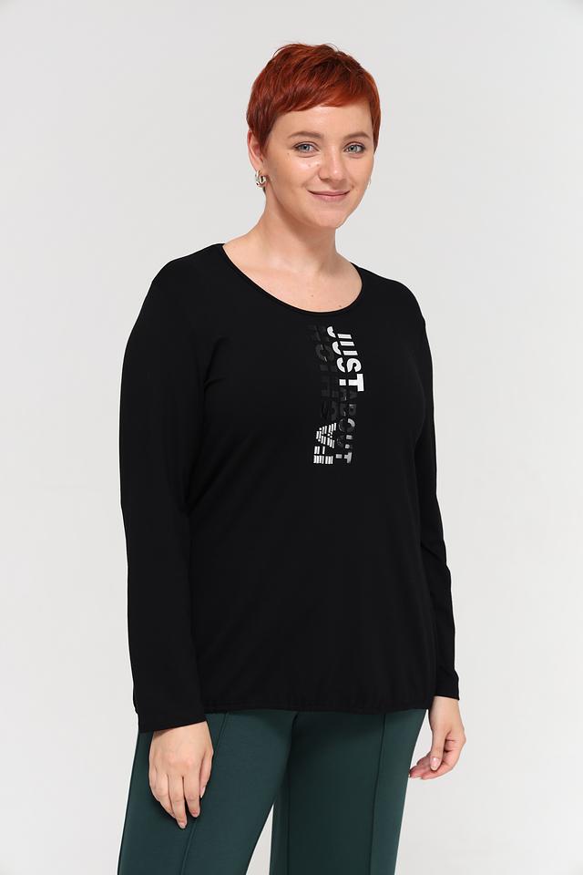 Черная блуза от Doris Streich с оригинальным принтом "JUST RIGHT". Изготовлена из мягкой вискозы с добавлением эластана для комфорта и лучшей посадки. Состав: вискоза 96%, эластан 4%