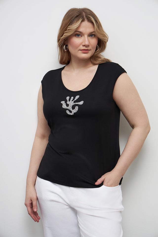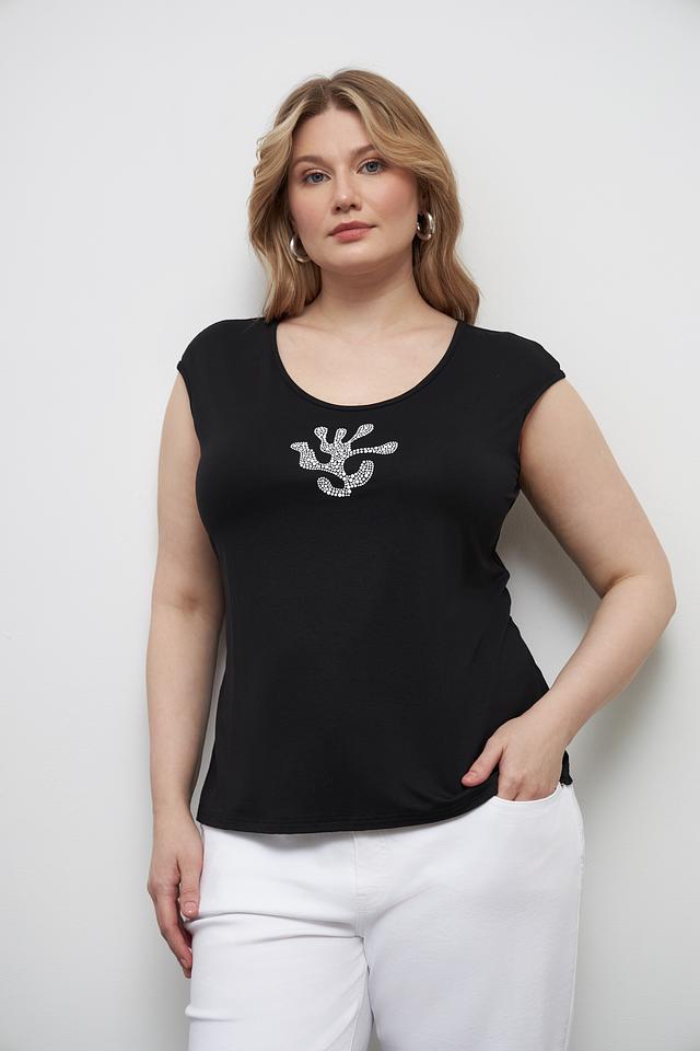 Особенностью данной модели является декоративная вышивка в области груди, выполненная в светлых тонах, что придает топу изысканность и оригинальность. Круглый вырез горловины и короткие рукава делают этот топ идеальным для теплой погоды.