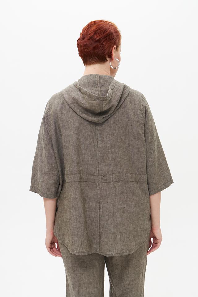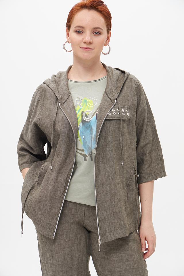 Серый льняной жакет от Doris Streich с капюшоном и застежкой-молнией. Изготовлен из 100% льна, что обеспечивает комфорт и воздухопроницаемость в теплую погоду. Оригинальный дизайн с декоративной отделкой. Состав: лен 100%
