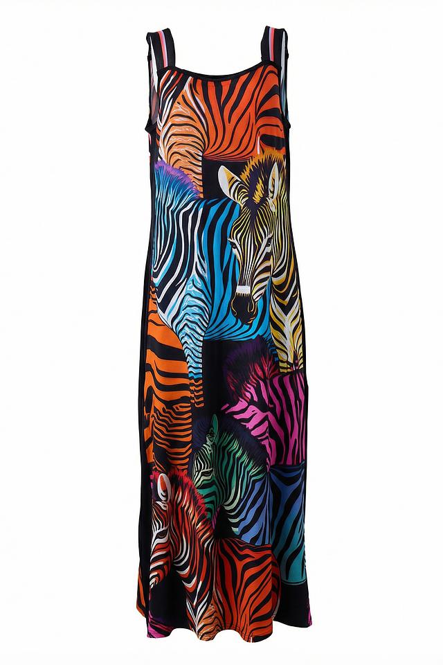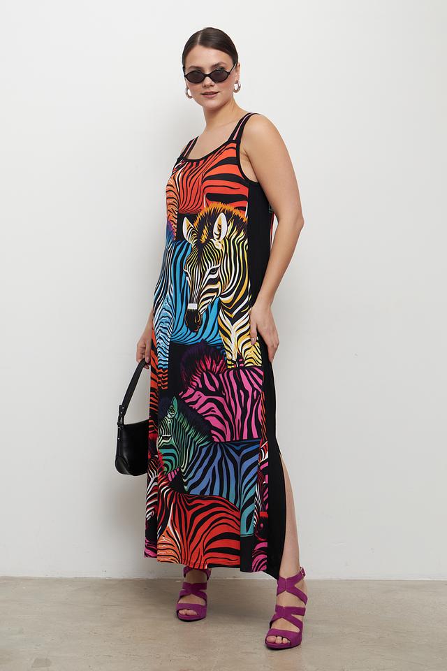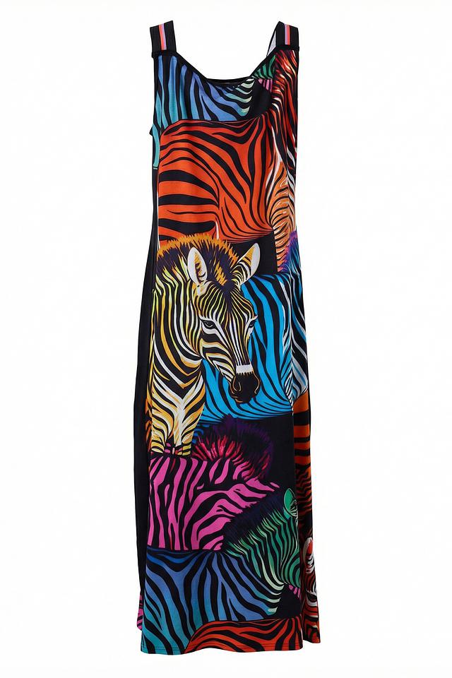 Платье выполнено из высококачественной вискозы с добавлением эластана (93% вискоза, 7% эластан), что делает его приятным на ощупь и обеспечивает хорошую драпировку. Яркий принт в виде зебр и тигров делает это платье уникальным и привлекающим внимание.