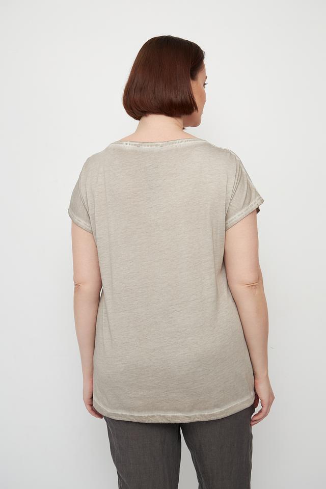 Футболка выполнена из мягкой и приятной к телу ткани, состоящей из 75% вискозы и 25% льна. Этот состав обеспечивает комфорт, воздухопроницаемость и легкость в уходе.
