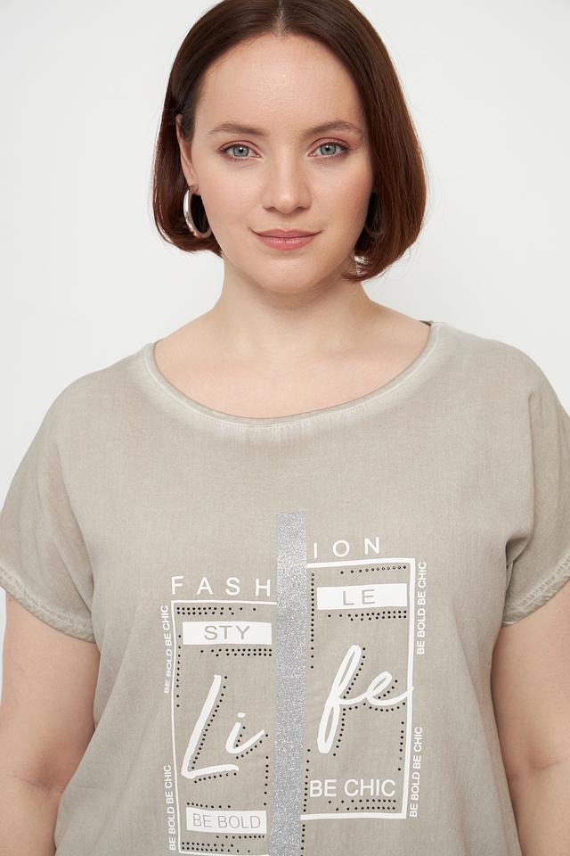 Модель имеет свободный крой, короткие рукава с небольшим подворотом и округлый вырез горловины. Передняя часть футболки украшена ярким принтом с надписью "Life" и слоганами на тему моды.