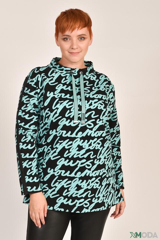 Пуловер имеет свободный крой и длинные рукава. Главная особенность модели – эффектный принт, состоящий из повторяющихся надписей на чёрном фоне. Вырез горловины оформлен в виде капюшона, дополненного шнурком для регулировки.