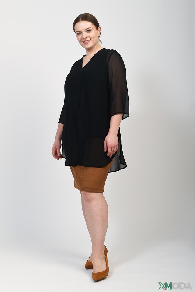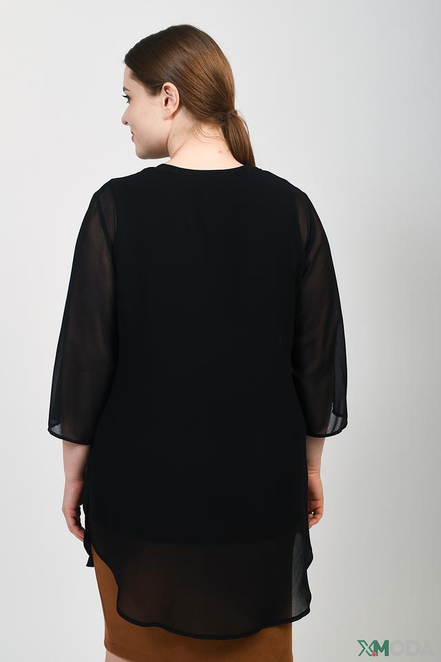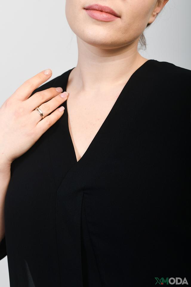 Блуза имеет V-образный вырез, который визуально удлиняет шею и делает образ более изящным. Рукава длиной 3/4 добавляют лёгкости и непринуждённости. Асимметричный подол придает блузе оригинальность и динамику.