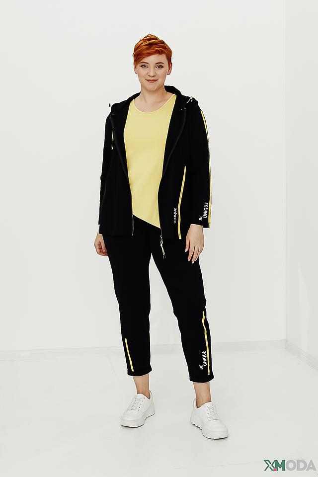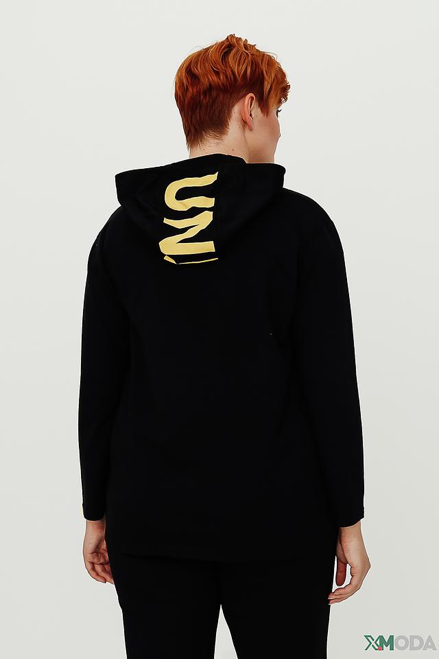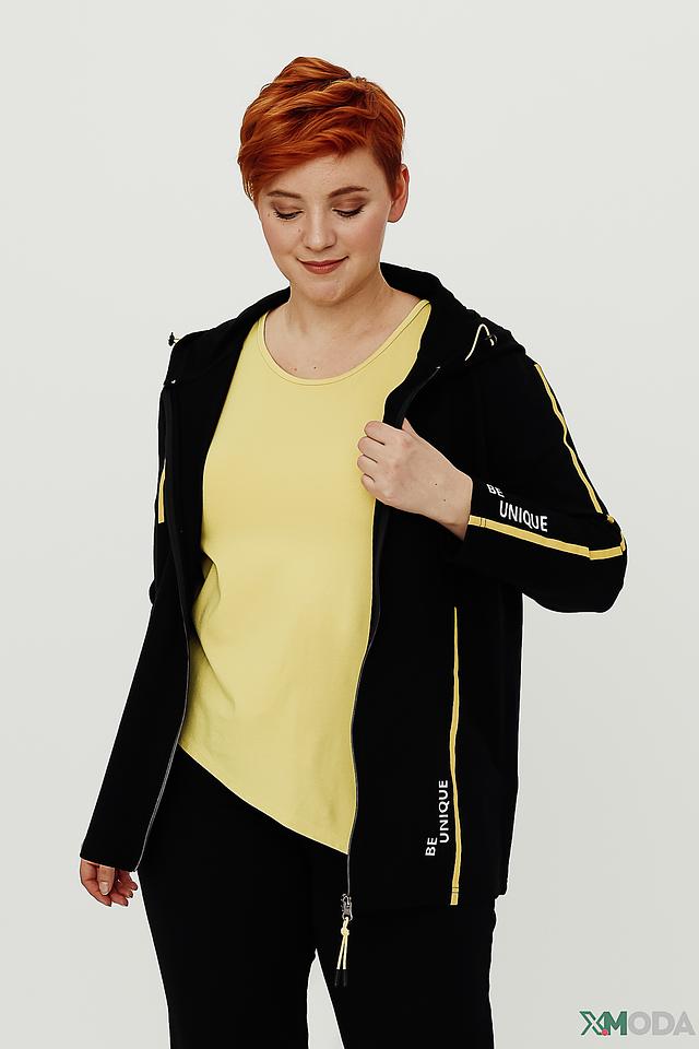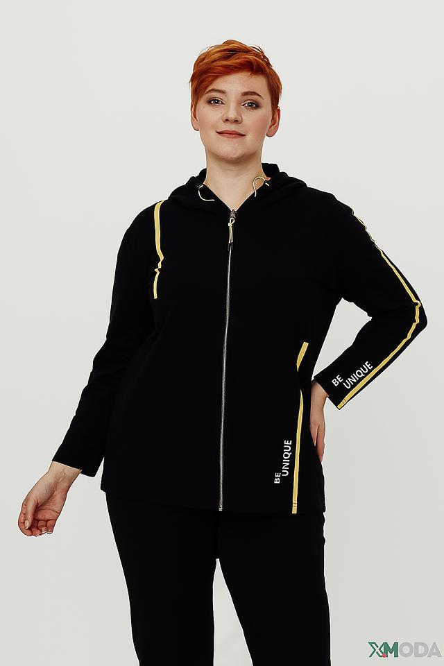Жакет от Doris Streich чёрного цвета с капюшоном и золотистой отделкой. Модель на молнии с надписью "BE UNIQUE" на рукавах и спине, выполненная из хлопка с добавлением модала и эластана. Состав: хлопок 47%, модал 47%, эластан 6%