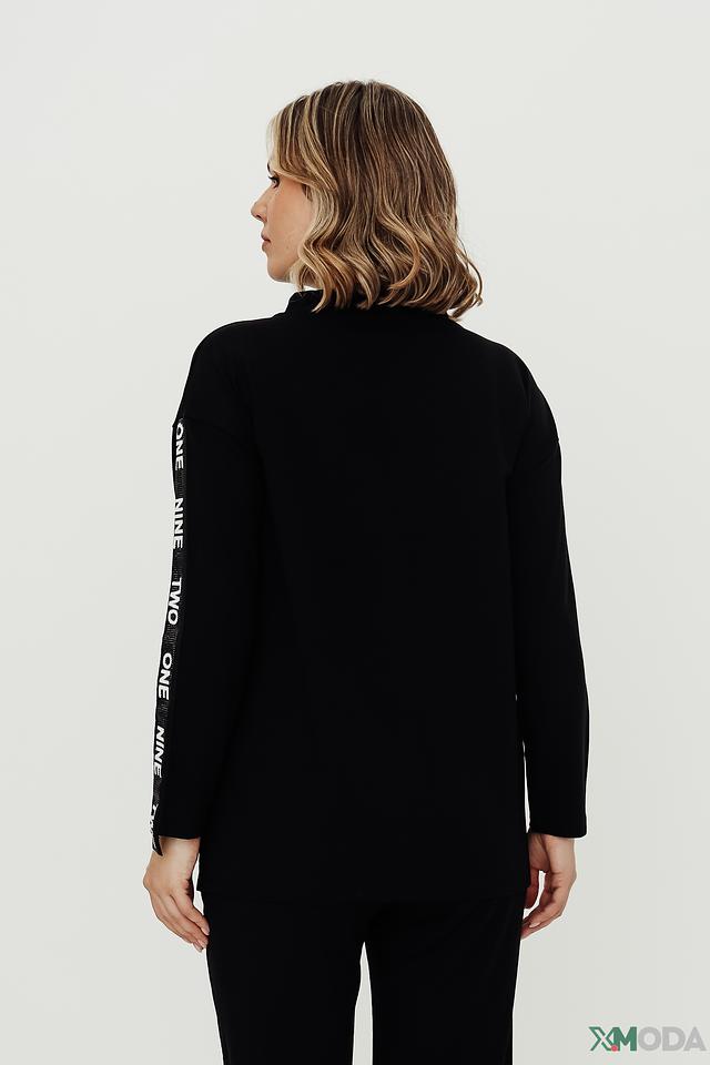 Пуловер имеет удобный капюшон и длинные рукава. Главной особенностью модели являются широкие полоски с надписью, расположенные по рукавам и вдоль центральной части изделия. Эти полоски добавляют образу динамичности и современности.