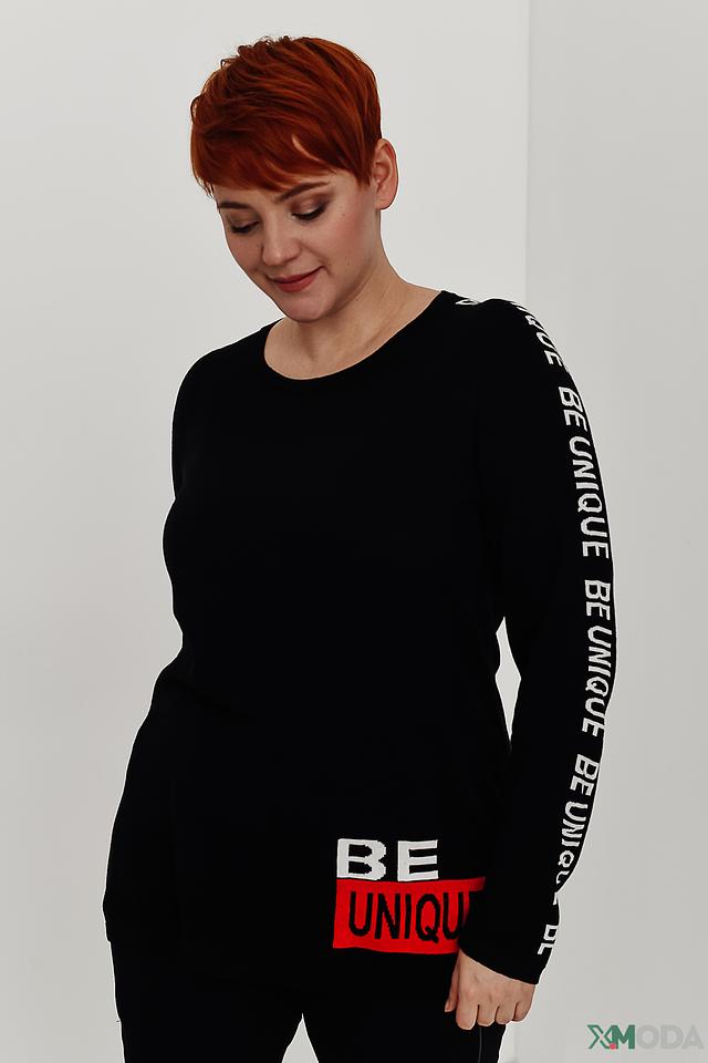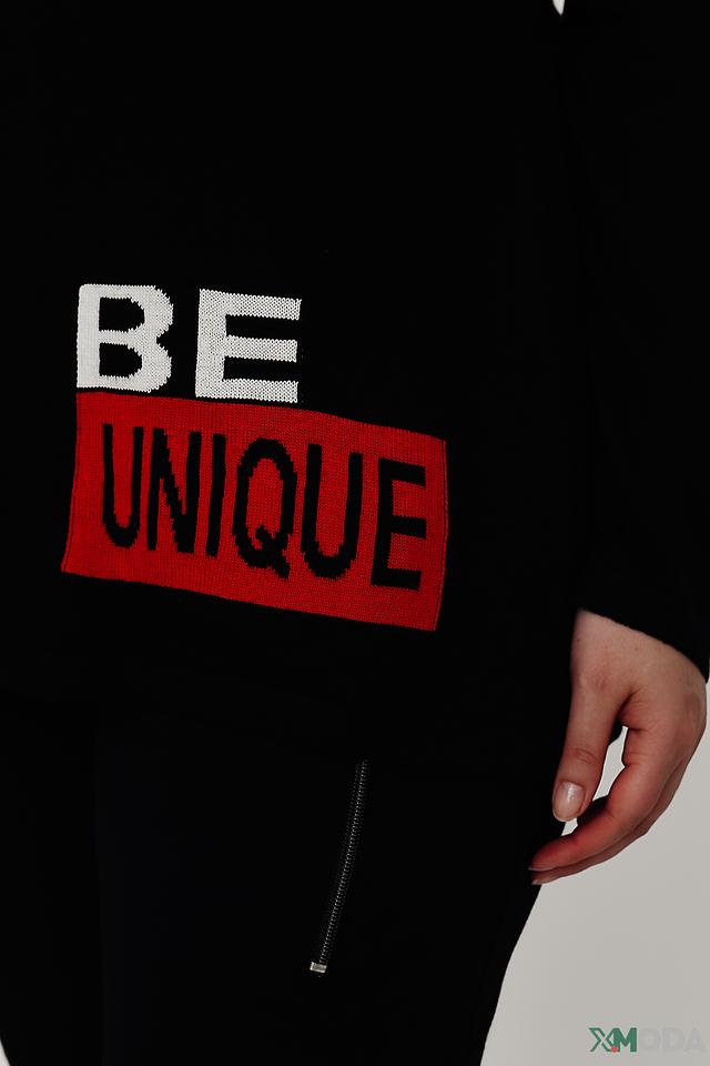 Пуловер имеет свободный крой, который не сковывает движений и позволяет создать расслабленный силуэт. Особенностью модели является яркая надпись "BE UNIQUE" на лицевой стороне и вдоль рукавов, выполненная в белом и красном цветах, что добавляет образу индивидуальности.