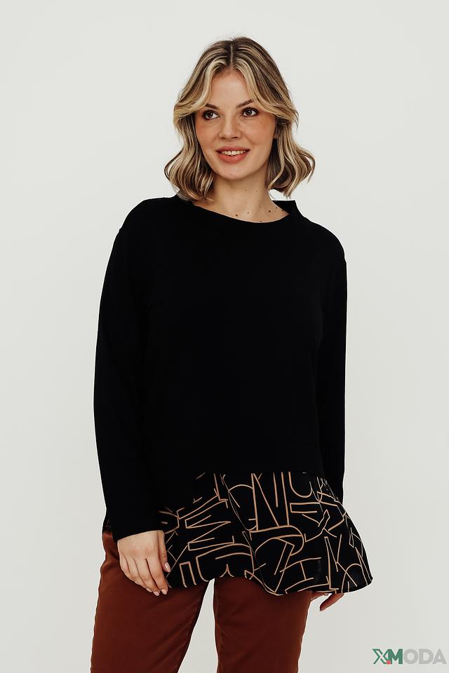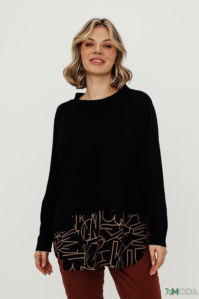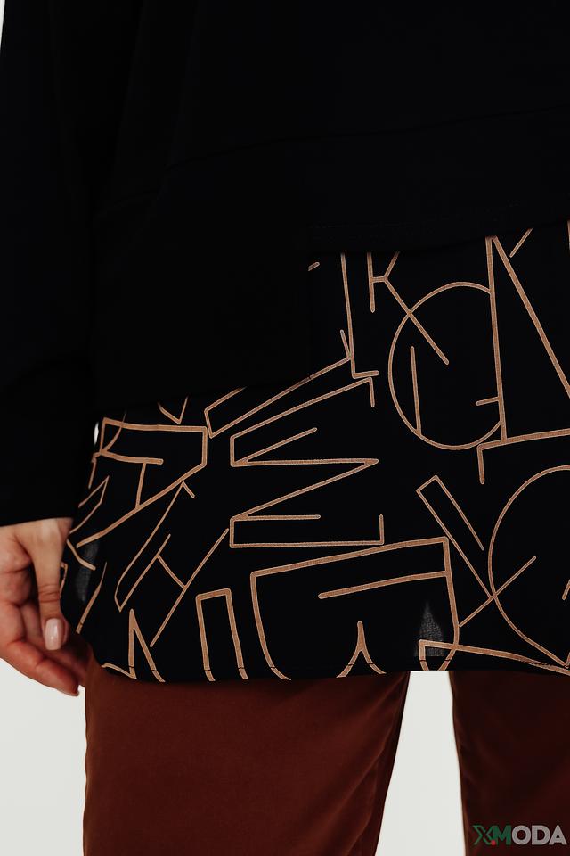 Особенностью модели является асимметричный подол с ярким белым принтом, который придает образу оригинальность и динамику. Блуза имеет свободный крой, не сковывающий движений, и удобный круглый вырез горловины.