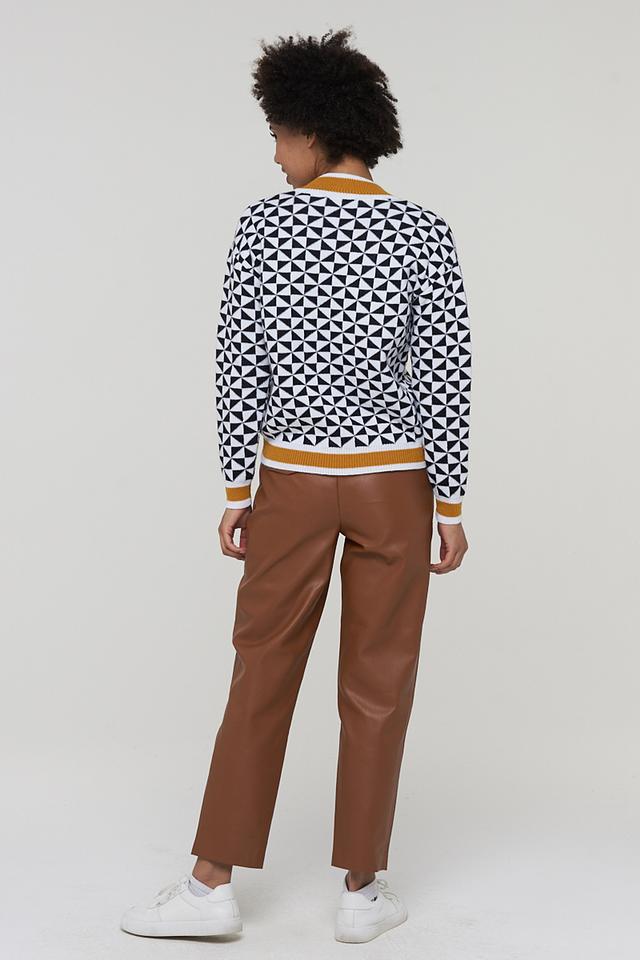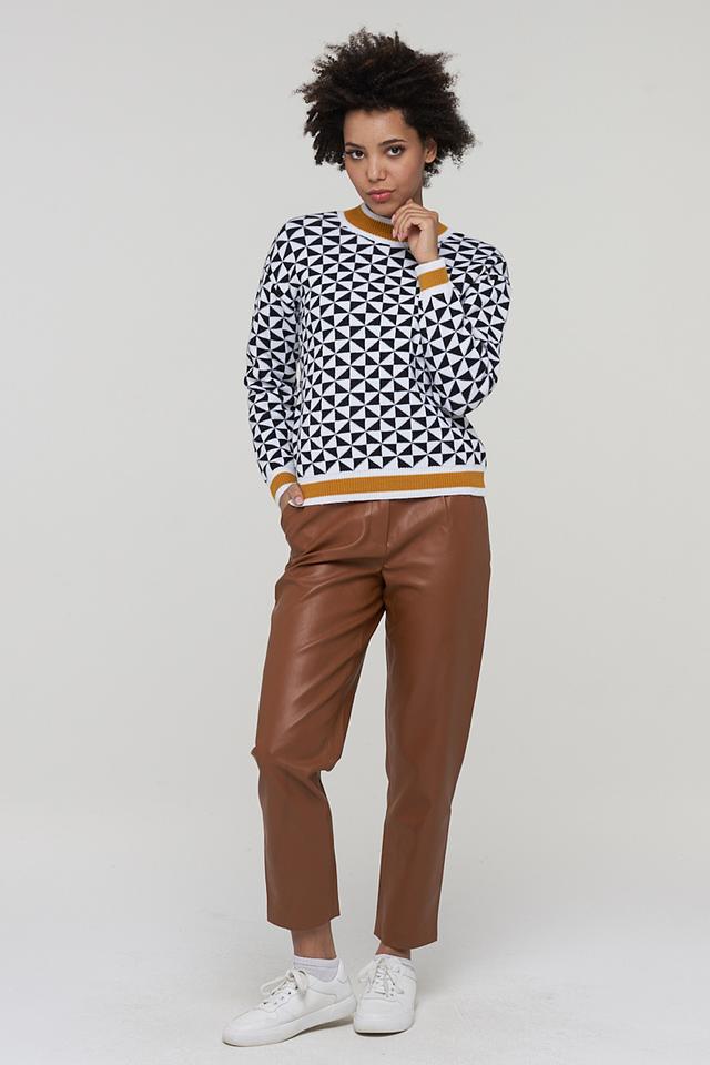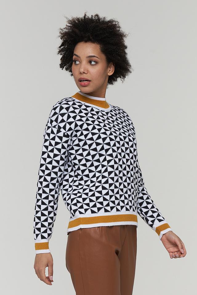 Этот стильный джемпер от BE YOU станет отличным выбором для тех, кто ценит комфорт и оригинальность. Модель выполнена в белом цвете и украшена эффектным геометрическим узором в черном и горчичном оттенках.