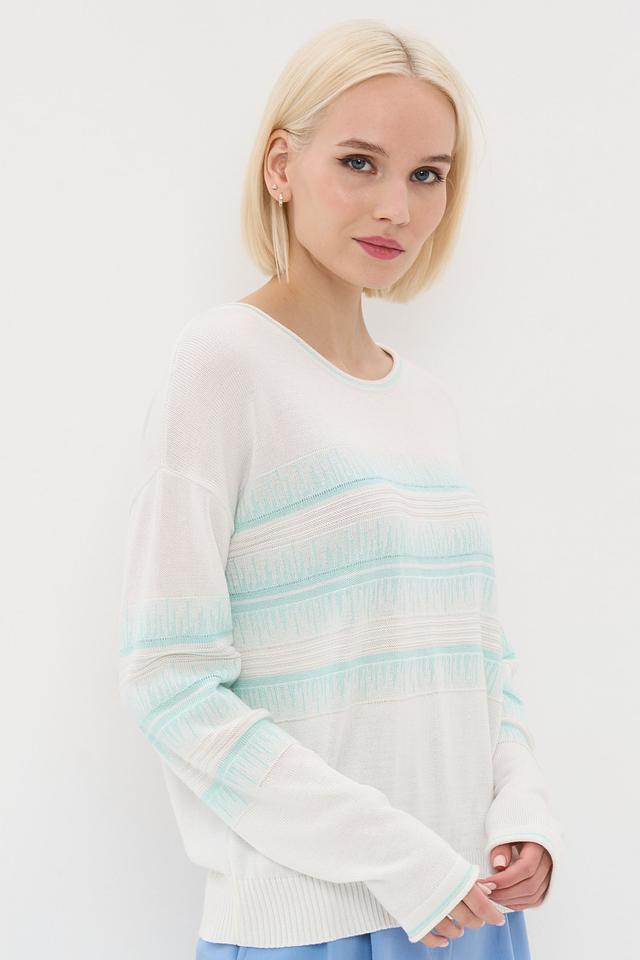 Представляем стильный джемпер от бренда BE YOU. Изделие выполнено в белом цвете и украшено горизонтальными полосками голубого оттенка.