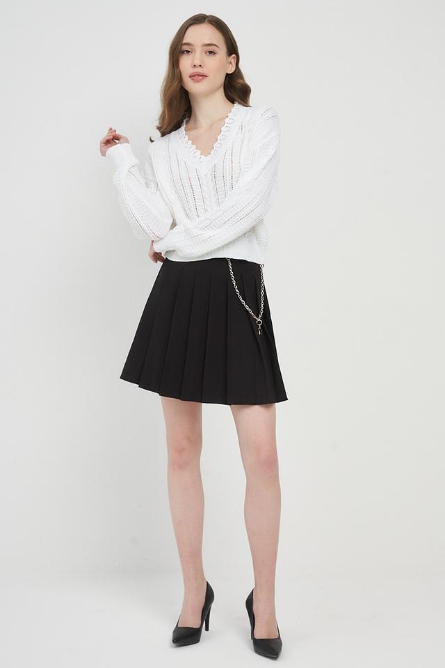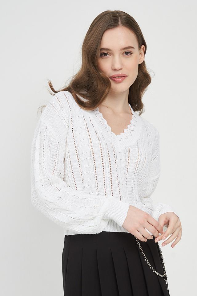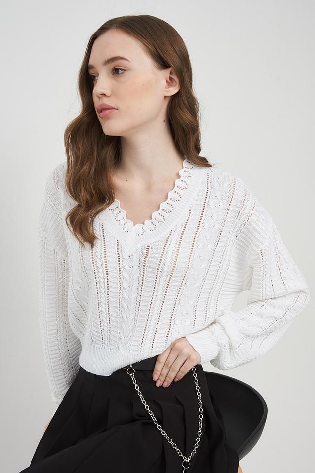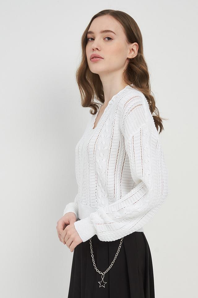 Белый джемпер от BE YOU с V-образным вырезом и ажурным узором. Модель выполнена из мягкой вискозы с добавлением хлопка и полиамида, что обеспечивает комфорт и приятные тактильные ощущения. Состав: вискоза 50%, пан 30%, хлопок 20%