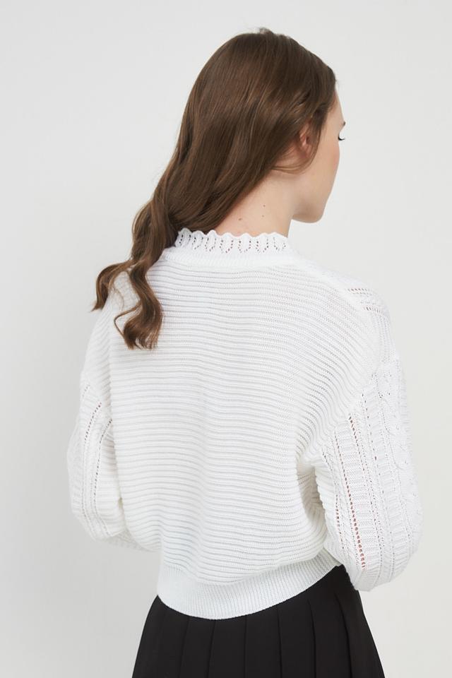 Ажурный узор придает джемперу легкость и воздушность, делая его идеальным выбором для создания романтичных образов. Джемпер имеет длинные рукава и слегка приталенный крой, который выгодно подчеркивает фигуру.