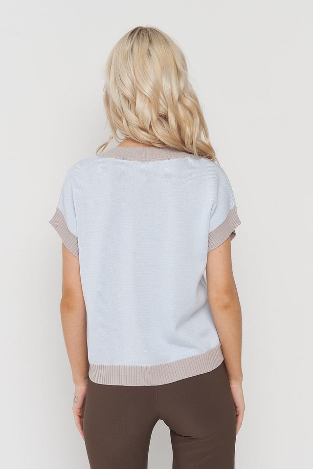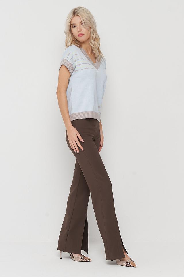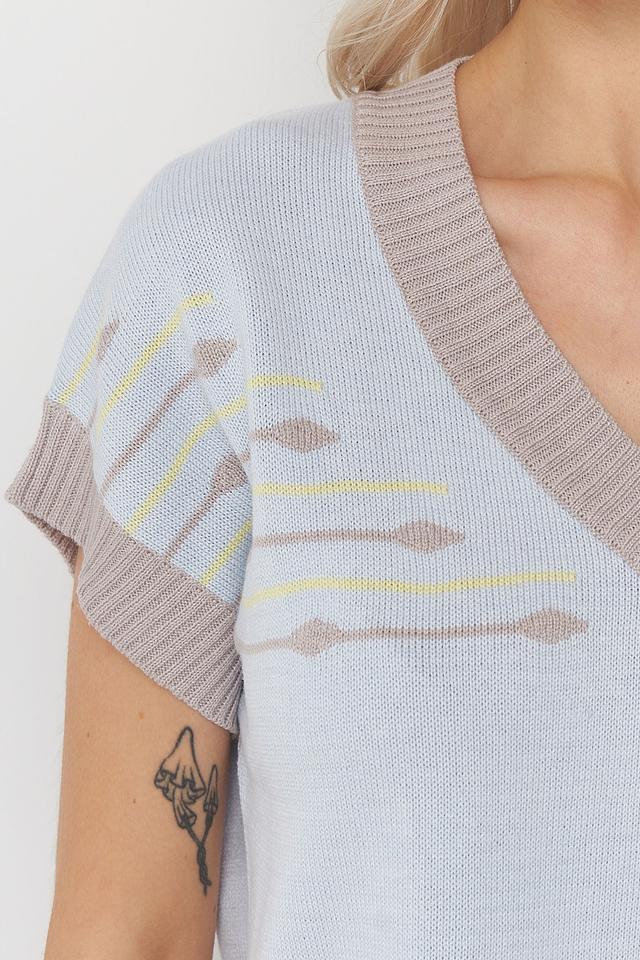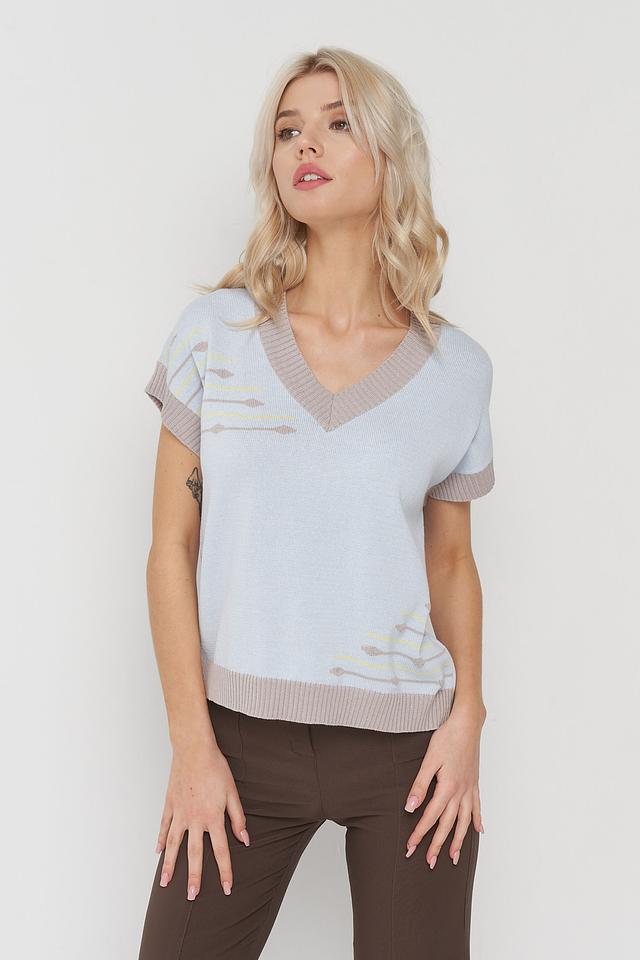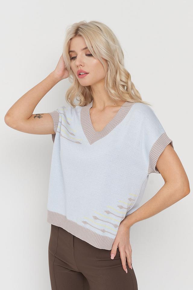 Джемпер имеет V-образный вырез, короткие рукава и кашкорсе, что делает его идеальным для создания многослойных образов. Особенностью данной модели является оригинальный узор в бежевых и жёлтых тонах, добавляющий изюминку и индивидуальность.