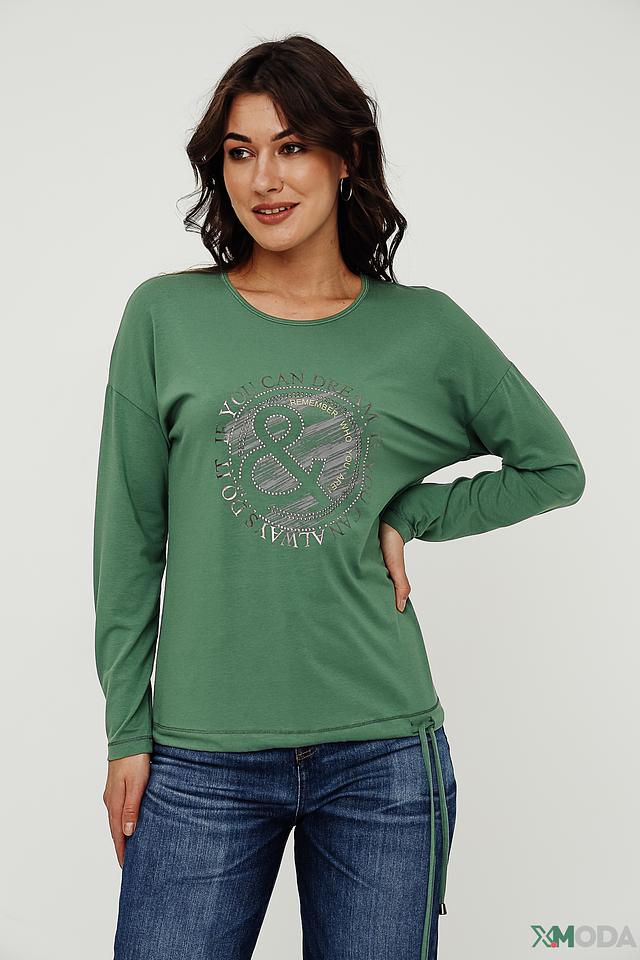 Зелёный джемпер от Bianca с оригинальным принтом и декоративными элементами. Изготовлен из мягкого и приятного к телу сочетания хлопка и модала, обеспечивающего комфорт в носке. Состав: хлопок 48%, модал 48%, эластан 4%