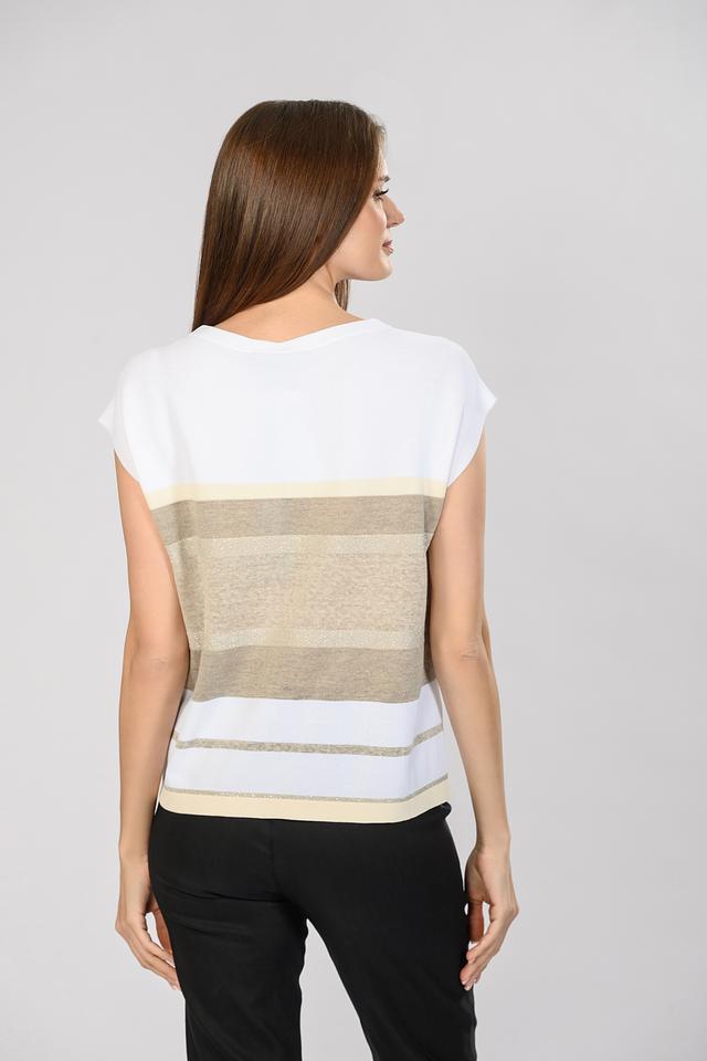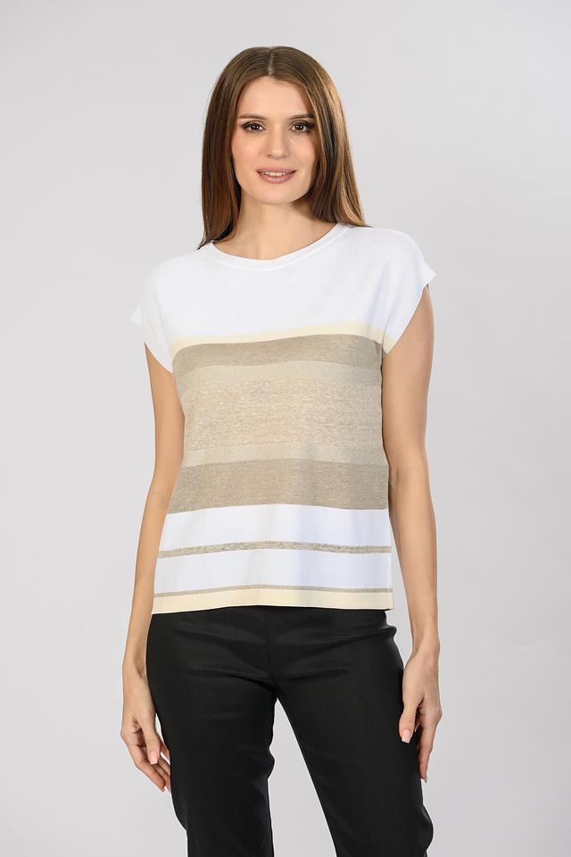 Бежевый джемпер от D. Exterior с короткими рукавами и горизонтальными полосами. Модель выполнена из мягкого трикотажа, сочетающего в себе вискозу, лен и полиамид, что обеспечивает комфорт и приятные тактильные ощущения. Состав: вискоза 57%, лен 23%, полиамид 15%, полиэстер 4%, полимер 1%