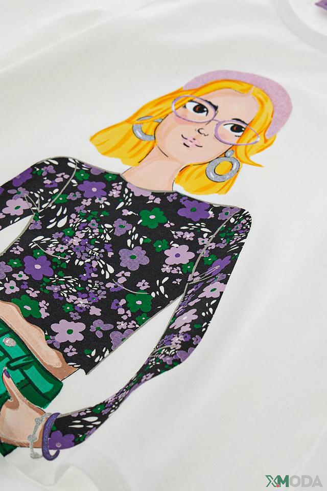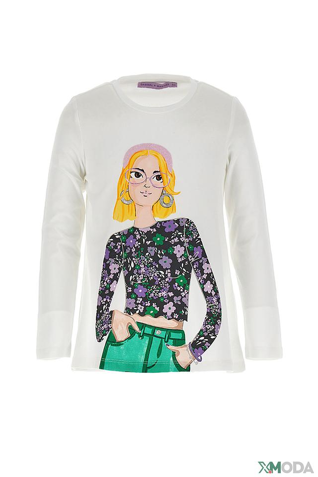 Этот очаровательный лонгслив от Original Marines станет отличным дополнением к гардеробу юной модницы. Выполненный в белом цвете, он украшен красочным принтом, изображающим девочку в модной одежде на фоне цветочного узора.